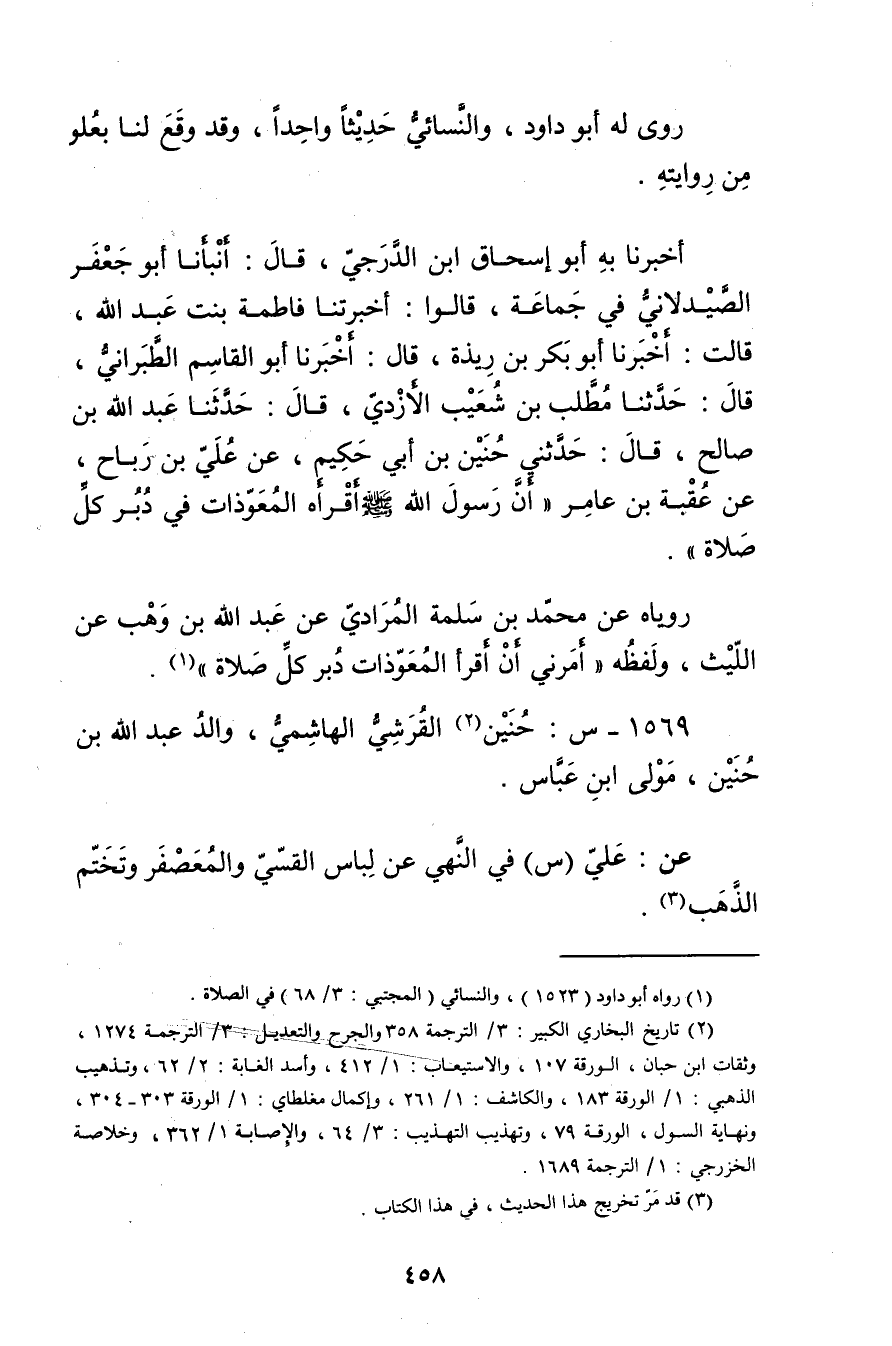 أَخْبَرَنَا بِهِ أَبُو إِسْحَاقَ ابْنُ الدَّرَجِيِّ، قال: أَنْبَأَنَا أَبُو جعفر الصَّيْدَلانِيّ فِي جماعة، قَالُوا: أَخْبَرَتْنا فَاطِمَةُ بِنْتُ عَبد اللَّهِ، قَالَتْ: أخبرنا أَبُو بَكْرِ بْنِ رِيذَةَ، قال: أخبرنا أَبُو الْقَاسِم الطبراني، قال: حَدَّثَنَا مطلب بْن شعيب الأزدي، قال: حَدَّثَنَا عَبد اللَّهِ بْنُ صَالِحٍ، قال: حَدَّثَنِي حُنَيْنُ بْنُ أَبي حَكِيمٍ، عَنْ عُلَيِّ بْنِ رَبَاحٍ، عَنْ عُقْبَةَ بْنِ عَامِرٍ"أَنَّ رَسُولَ اللَّهِ صلى الله عليه وسلم أَقْرَأَهُ الْمُعَوِّذَاتِ فِي دُبُرِ كُلِّ صَلاةٍ.