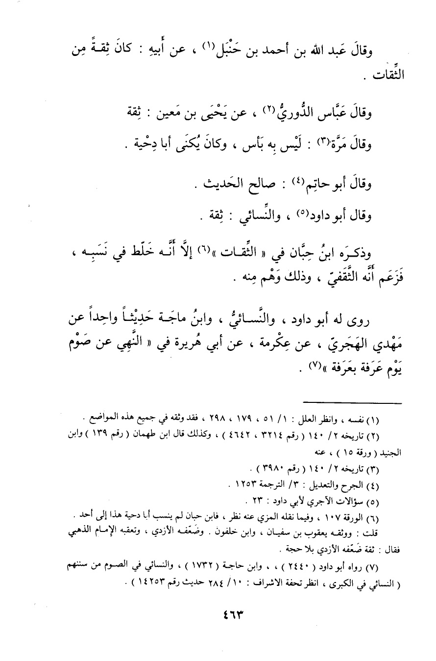 (6) الورقة 107، وفيما نقله المزي عنه نظر، فابن حبان لم ينسب أبا دحية هذا إلى أحد. قلت: ووثقه يعقوب بن سفيان، وابن خلفون، وضعفه الأزدي، وتعقبه الإمام الذهبي فقال: ثقة ضعفه الأزدي بلا حجة.