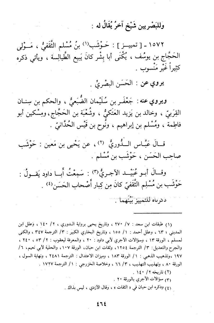 1572 - تمييز: حوشب بن مسلم الثقفي (1) ، مولى الحجاج بن يوسف، يكنى أبا بشر كان يبيع الطيالسة، ويأتي ذكره كثيرا غيرمنسوب.