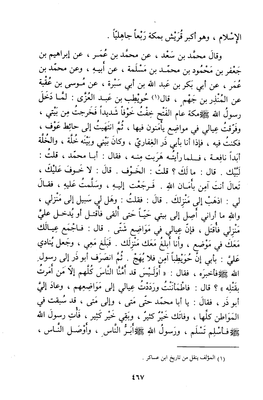 وَقَال مُحَمَّدُ بْنُ سعد، عن مُحَمَّد بْن عُمَر، عن إِبْرَاهِيم بْن جعفر بْن محمود بْن مُحَمَّد بْن مسلمة، عَن أَبِيهِ، وعَنْ مُحَمَّدِ بْنِ عُمَر، عَن أَبِي بَكْرِ بْنِ عَبد الله بْن أَبي سبرة، عن موسى بْن عقبة عن الْمُنْذِرِ بْنِ جَهْمٍ، قال (1) حُوَيْطِبُ بن عبد العزى: لَمَّا دَخَلَ رَسُولُ اللَّهِ صَلَّى اللَّهُ عَلَيْهِ وسَلَّمَ مَكَّةَ عَامَ الْفَتْحِ خِفْتُ خَوْفًا شَدِيدًا فَخَرَجْتُ مِنْ بَيْتِي، وفَرَّقْتُ عِيَالِي فِي مَوَاضِعَ يَأْمَنُونِ فِيهَا، ثُمَّ انْتَهَيْتُ إِلَى حَائِطِ عَوْفٍ، فَكُنْتُ فِيهِ، فَإِذَا أَنَا بِأَبِي ذَرٍّ الْغِفَارِيِّ، وكَانَ بَيْنِي وبَيْنَهُ خُلَّةٌ، والْخُلَّةُ أَبَدًا نَافِعَةٌ، فَلَمَّا رَأَيْتُهُ هَرَبْتُ مِنْهُ، فَقَالَ: أَبَا مُحَمَّدٍ، قُلْتُ: لَبَّيْكَ. قال: مَا لَكَ؟ قُلْتُ: الْخَوْفُ. قال: لا خَوْفَ عَلَيْكَ،