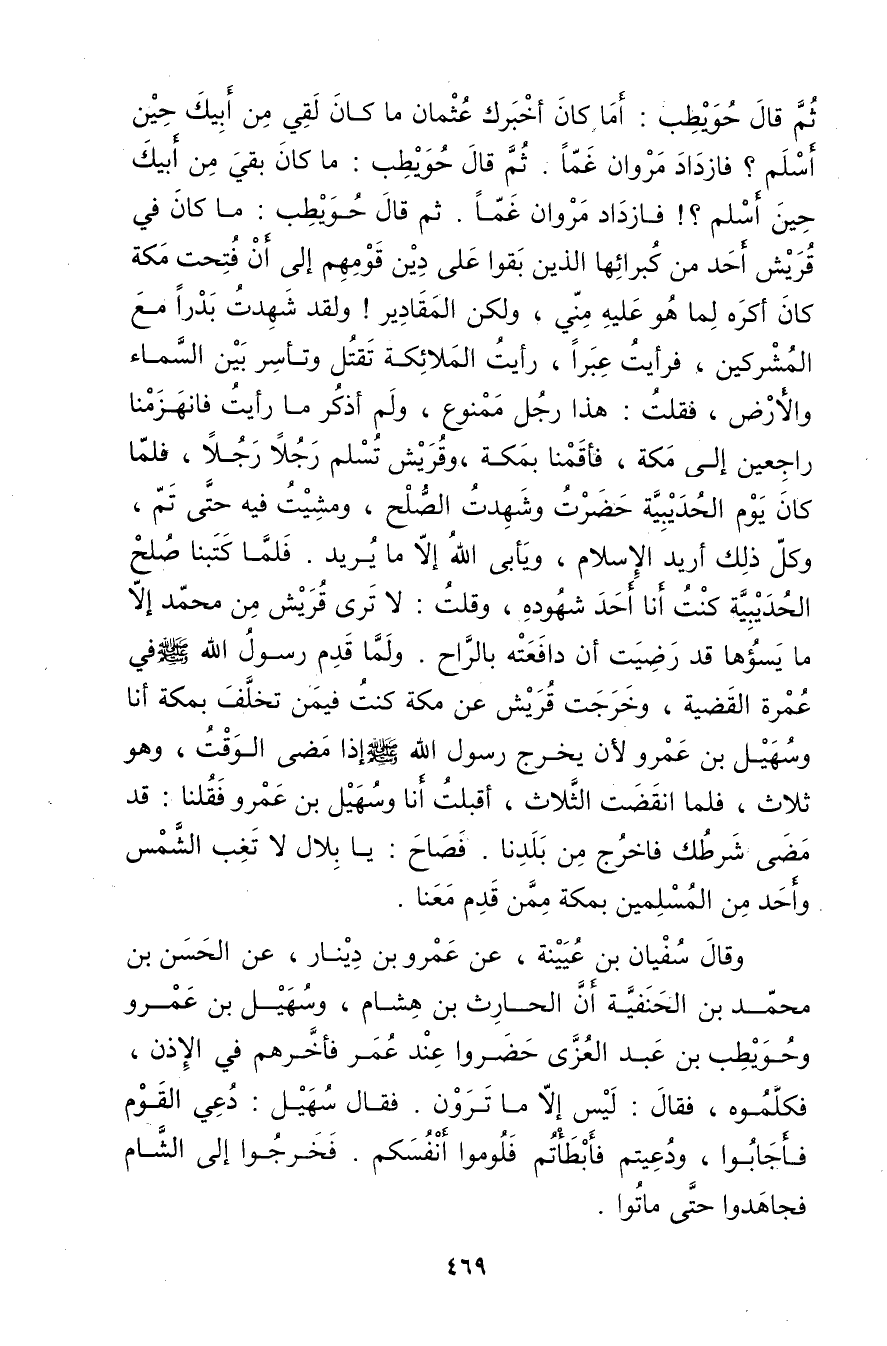 ثم قال حويطب: أما كان أخبرك عثمان ما كان لقي من أبيك حين أسلم؟ فازداد مروان غما. ثم قال حويطب: ما كان بقي من أبيك حين أسلم؟ ! فازداد مروان غما. ثم قال حويطب: ما كان في قريش أحد من كبرائها الذين بقوا على دين قومهم إلى أن فتحت مكة كان أكره لما هو عليه مني، ولكن المقادير! ولقد شهدت بدرا مع المشركين، فرأيت عبرا، رأيت الملائكة تقتل وتأسر بين السماء والأرض، فقلت: هذا رجل ممنوع، ولم أذكر ما رأيت فانهزمنا راجعين إلى مكة، فأقمنا بمكة، وقريش تسلم رجلاً رجلا، فلما كان يوم الحديبية حضرت وشهدت الصلح، ومشيت فيه حتى تم، وكل ذلك أريد الإسلام، ويأبى الله إلا ما يريد. فلما كتبنا صلح الحديبية كنت أنا أحد شهوده، وقلت لا ترى قريش من مُحَمَّد إلا ما يسؤها قد رضيت أن دافعته بالراح. ولما قدم رَسُول اللَّهِ صلى الله عليه وسلم في عُمَرة القضية، وخرجت قريش عن مكة كنت فيمن تخلف بمكة أنا وسهيل بن عَمْرو لأن يخرج رَسُول اللَّهِ صلى الله عليه وسلم إِذَا مضى الوقت، وهو ثلاث، فلما انقضت الثلاث، أقبلت أنا وسهيل بن عَمْرو فقلنا: قد مضى شرطك فاخرج من بلدنا. فصاح: يا بلال لا تغب الشمس وأحد من المسلمين بمكة ممن قدم معنا.