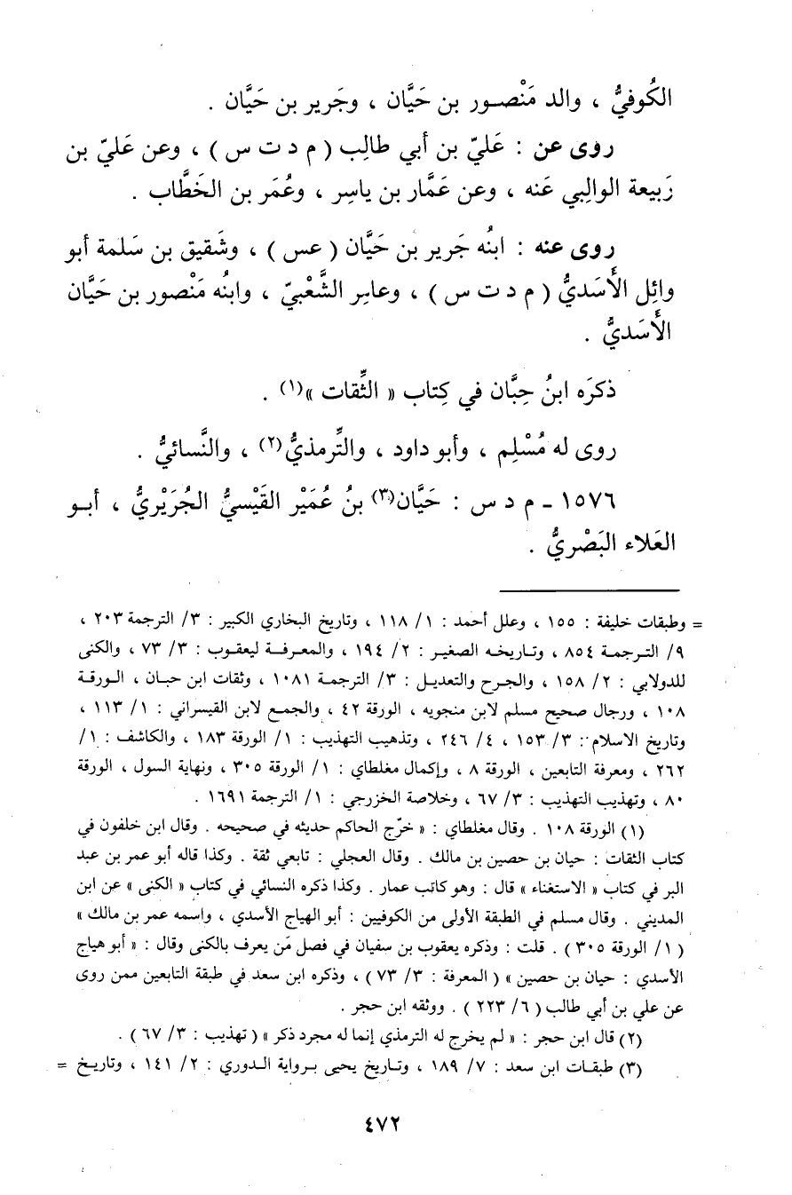 وَقَال ابن خلفون في كتاب الثقات: حيان بن حصين بن مالك. وَقَال العجلي: تابعي ثقة. وكذا قاله أبو عُمَر بن عَبد الْبَرِّ في كتاب"الاستغناء"قال: وهو كاتب عمار. وكذا ذكره النَّسَائي في كتاب"الكنى"عن ابن المديني. وَقَال مسلم في الطبقة الاولى من الكوفيين: أبو الهياج الأسدي، واسمه عُمَر بن مالك" (1 / الورقة 305) . قلت: وذكره يعقوب بن سفيان في فصل من يعرف بالكنى وَقَال: أبو هياج الأسدي: حيان بن حصين" (المعرفة: 3 / 73) ، وذكره ابن سعد في طبقة التابعين ممن روى عن على بن أَبي طالب (6 / 223) . ووثقه ابن حجر.