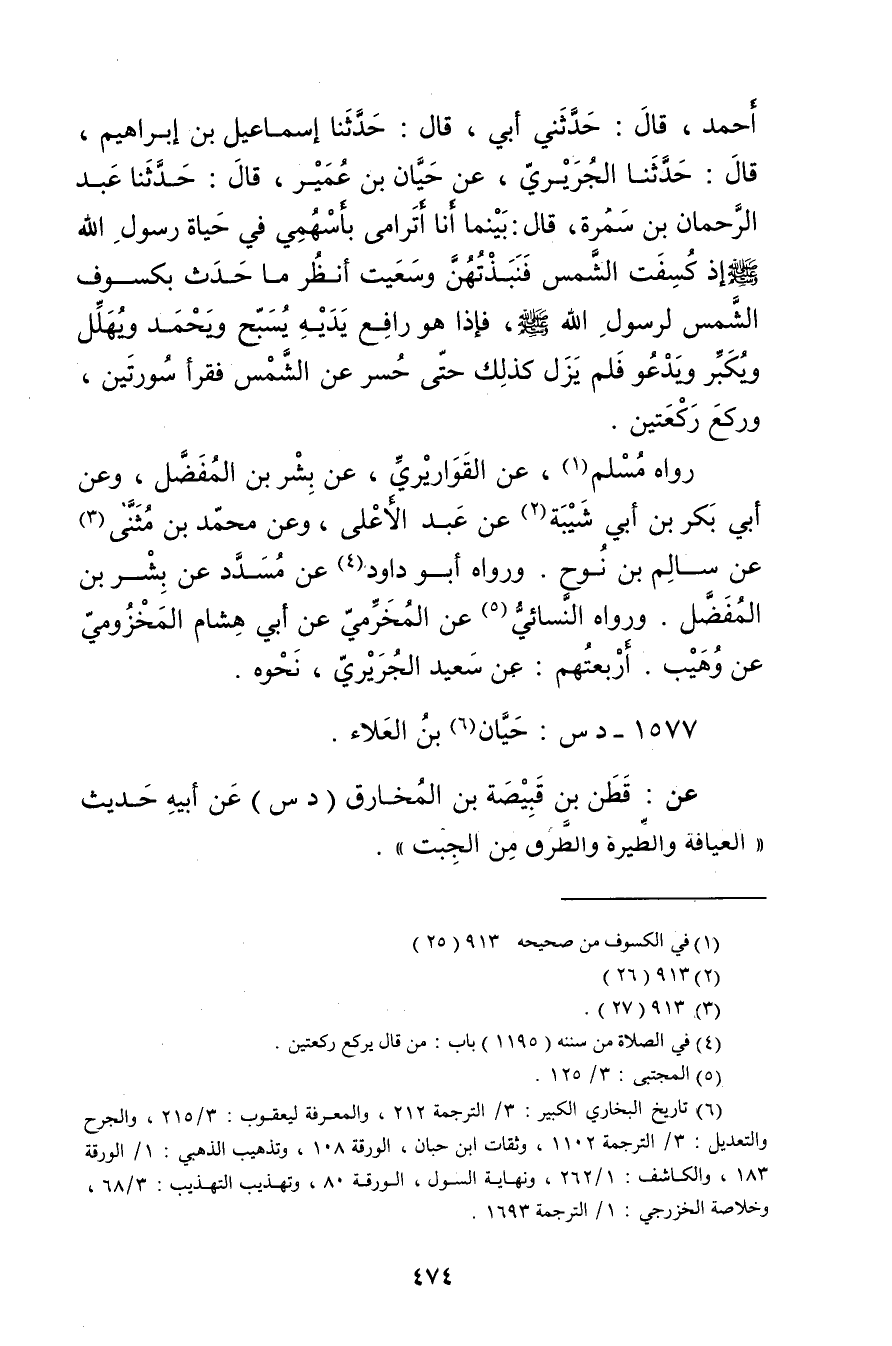 أَحْمَدَ، قال: حَدَّثني أبي، قال: حَدَّثَنَا إِسْمَاعِيلُ بْنُ إِبْرَاهِيمَ، قال: حَدَّثَنَا الْجُرَيْرِيُّ، عَنْ حَيَّانَ بْنِ عُمَير، قال: حَدَّثَنَا عَبْدُ الرَّحْمَنِ بْنُ سَمُرَة، قال: بَيْنَمَا أَنَا أَتَرَامَى بِأَسْهُمِي فِي حَيَاةِ رَسُول اللَّهِ صلى الله عليه وسلم إذا كُسِفَتِ الشَّمْسُ فَنَبَذْتُهُنَّ وسَعَيْتُ أَنْظُرُ مَا حَدَثَ بِكُسُوفِ الشَّمْسِ لِرَسُولِ اللَّهِ صلى الله عليه وسلم، فَإِذَا هُوَ رَافِعٌ يَدَيْهِ يُسَبِّحُ ويَحْمَدُ ويُهَلِّلُ ويُكَبِّرُ ويَدْعُو فَلَمْ يَزَلْ كَذَلِكَ حَتَّى حُسِرَ عَنِ الشَّمْسِ فَقَرَأَ سُورَتَيْنِ، ورَكَعَ رَكْعَتَيْنِ.
