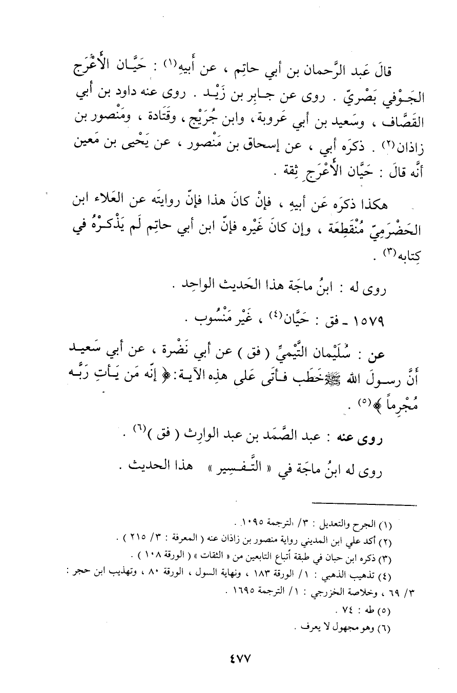 روى عن جابر بن زيد. روى عنه داود بن أَبي القصاف، وسَعِيد بن أَبي عَرُوبَة، وابن جُرَيْج، وقتادة، ومنصور بن زاذان (2) . ذكره أبي، عَنْ إِسْحَاقَ بْنِ مَنْصُورٍ، عَنْ يَحْيَى بْن مَعِين إنه قال: حيان الأعرج ثقة.