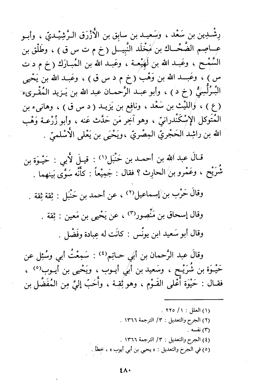 وَقَال عَبْد الرَّحْمَنِ بْن أَبي حاتم (4) : سمعت أبي وسئل عن حيوة بْن شريح، وسَعِيد بْن أَبي أيوب، ويحيى بن أيوب (5) ، فَقَالَ: حيوة أعلى القوم، وهو ثقة، وأحب إلى من المفضل بْن
