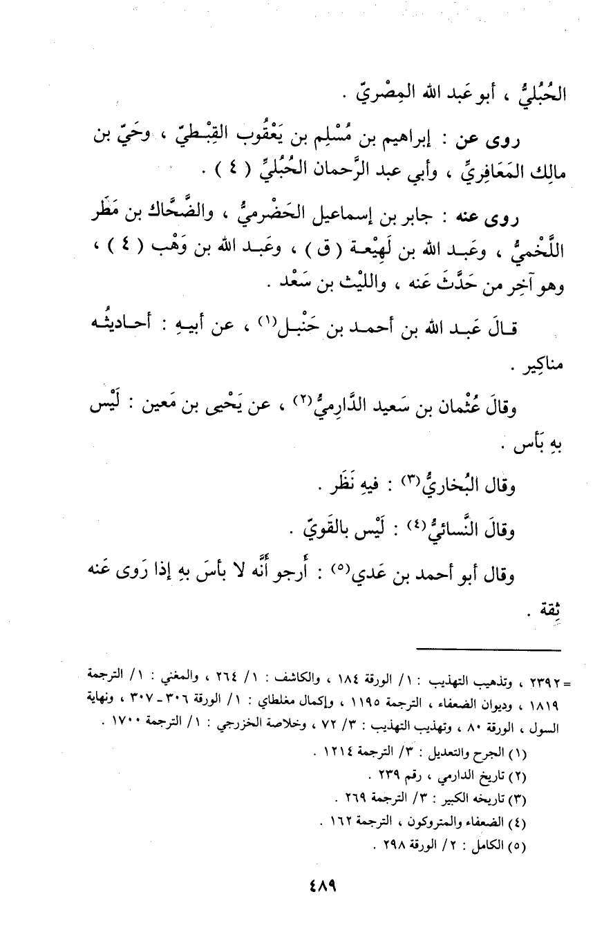 = 2392، وتذهيب التهذيب: 1 / الورقة 184، والكاشف: 1 / 264، والمغني: 1 / الترجمة 1819، وديوان الضعفاء، الترجمة 1195، وإكمال مغلطاي: 1 / الورقة 306 - 307، ونهاية السول، الورقة 80، وتهذيب التهذيب: 3 / 72، وخلاصة الخزرجي: 1 / الترجمة 1700.