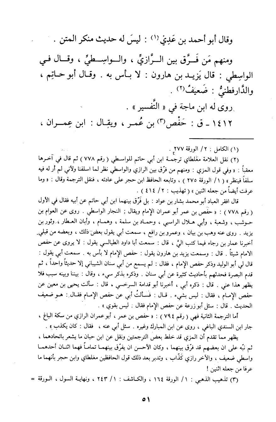 أما الترجمة الثانية فهي (رقم 794) : حفص بن عُمَر، أبوعِمْران الرازي من سكة الباغ، جار ابن السندي الباغي، روى عن ابن المبارك وغيره.