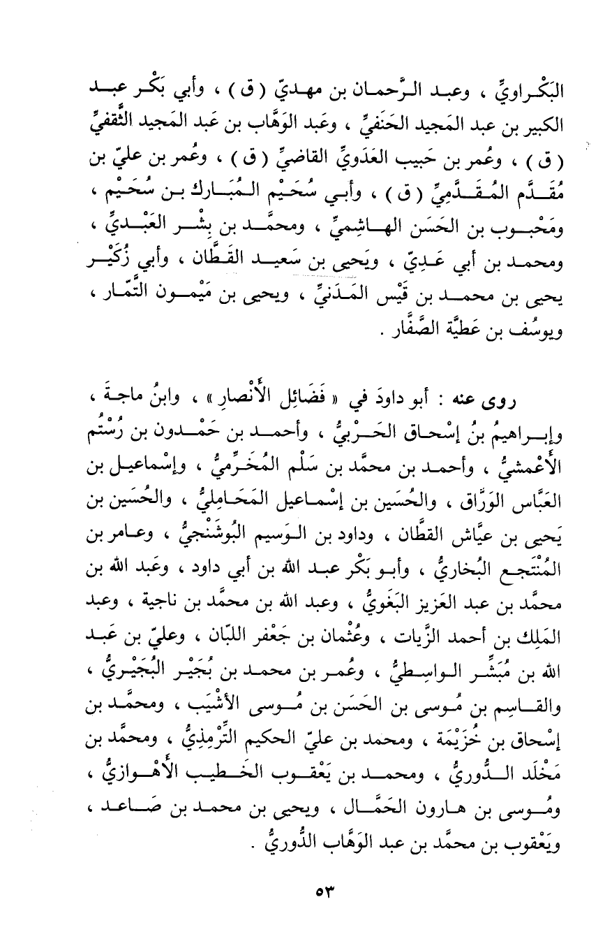البكراوي، وعبد الرحمن بْن مهدي (ق) ، وأَبِي بَكْرٍ عبد الكبير بْن عَبد المجيد الحنفي، وعبد الوهاب بْن عَبد المجيد الثقفي (ق) ، وعُمَر بن حبيب العدوي القاضي (ق) ، وعُمَر بن علي بن مقدم المقدمي (ق) ، وأبي سحيم المبارك بن سحيم، ومحبوب بن الحسن الهاشمي، ومُحَمَّد بن بشر العبدي، ومُحَمَّد بن أَبي عدي، ويحيى بن سَعِيد القطان، وأبي زكير يَحْيَى بْن مُحَمَّد بن قيس المدني، ويحيى بن ميمون التمار، ويوسف بن عطية الصفار.