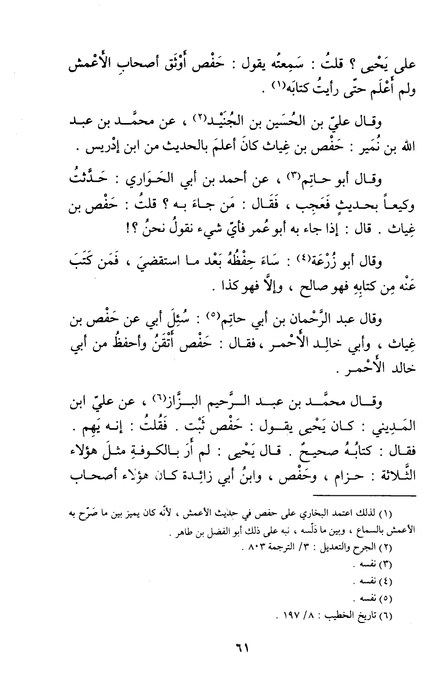 (1) لذلك اعتمد البخاري على حفص في حديث الأعمش، لانه كان يميز بين ما صرح به الأعمش بالسماع، وبين ما دلسه، نبه على ذلك أبو الفضل بن طاهر.