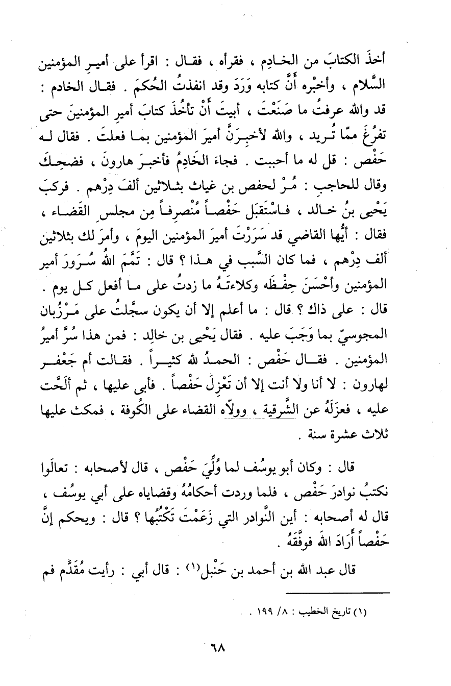 أخذ الكتاب من الخادم، فقرأه، فَقَالَ: اقرأ على أمير المؤمنين السلام، وأخبره أن كتابه ورد وقد أنفذت الحكم. فَقَالَ الخادم: قد والله عرفت ما صنعت، أبيت أن تأخذ كتاب أمير المؤمنين حتى تفرغ مما تريد، والله لأخبرن أمير المؤمنين بما فعلت. فَقَالَ له حفص: قل له ما أحببت.