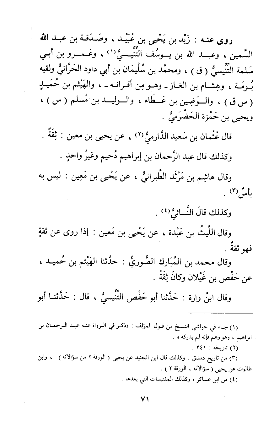 (3) من تاريخ دمشق. وكذلك قال ابن الجنيد عن يحيى (الورقة 2 من سؤالاته) ، وابن طالوت عن يحيى (سؤالاته، الورقة 2) .