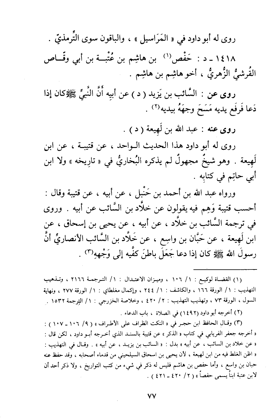 (3) وَقَال الحافظ ابن حجر في "النكت الظراف على الاطراف" (9 / 106 - 107) : أخرجه جعفر الفريابي في كتاب"الذكر"عن قتيبة بالسند الذي أخرجه أبو داود، لكن قال: عن خلاد بن السائب، عَن أبيه"بدل: السائب بن يزيد، عَن أبيه". وَقَال في التهذيب: اظن الغلط فيه من ابن لَهِيعَة، لان يحيى بن إسحاق السيلحيني من قدماء أصحابه، وقد حفظ عنه حبان بن واسع، وأما حفص بن هاشم فليس له ذكر فِي شيء من كتب التواريخ، ولا ذكر أحد أن لابن عتبة ابنا يسمى حفصا" (2 / 420 - 421) .