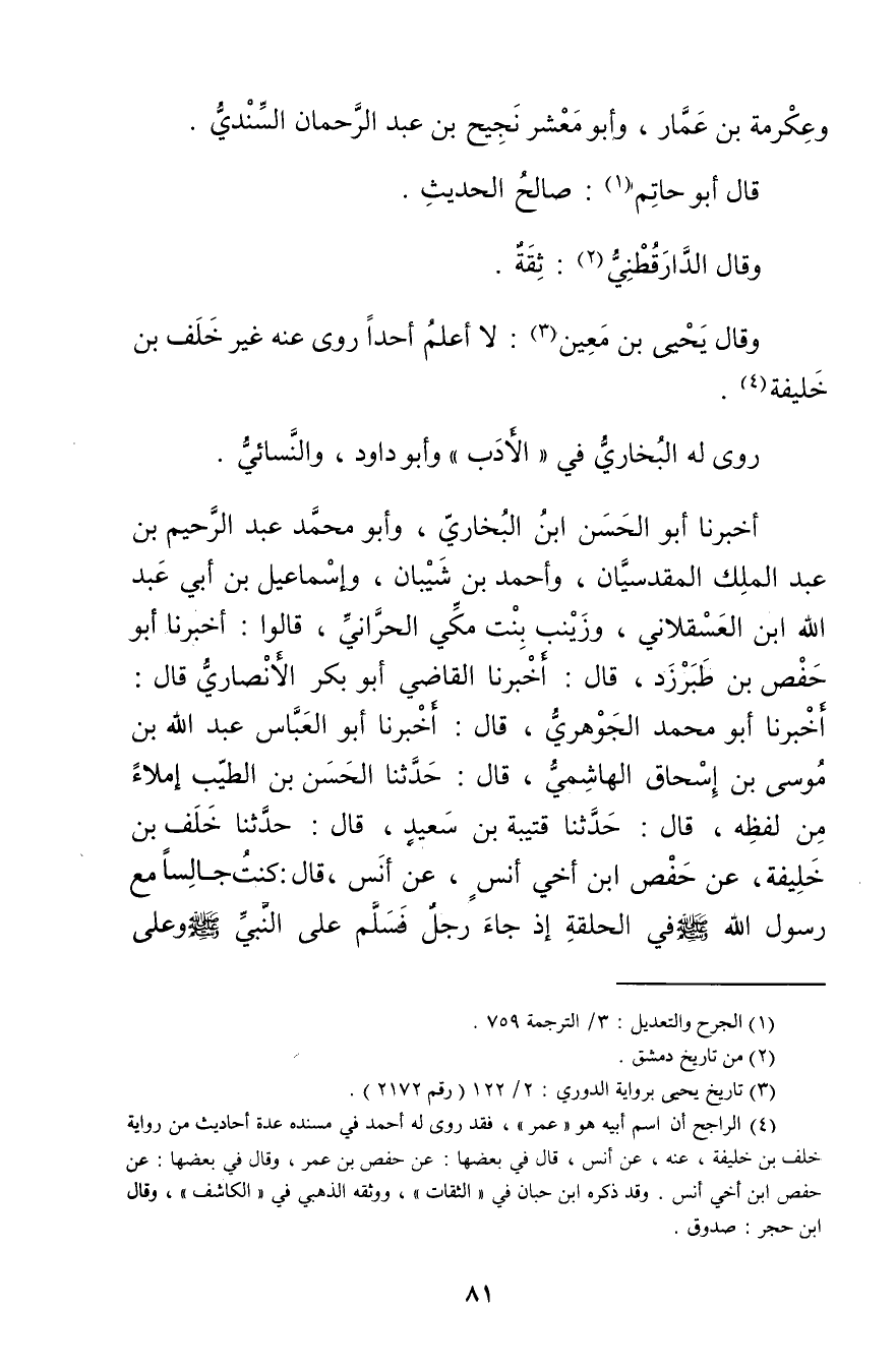 أَخْبَرَنَا أَبُو الحسن بْن البخاري، وأبو مُحَمَّد عَبد الرحيم بْن عَبد المَلِك الْمَقْدِسِيَّانِ، وأَحْمَدُ بْنُ شَيْبَانَ، وإسماعيل بْن أَبي عَبْد الله بْنِ الْعَسْقَلانِيُّ، وزَيْنَبُ بِنْتُ مَكِّيٍّ الْحَرَّانِيُّ، قَالُوا: أخبرنا أَبُو حَفْصٍ بن طَبَرْزَذَ، قال: أخبرنا الْقَاضِي أَبُو بَكْرٍ الأَنْصارِيّ قال: أخبرنا أَبُو مُحَمَّدٍ الْجَوْهَرِيُّ، قال: أَخْبَرَنَا أَبُو الْعَبَّاسِ عَبد الله بن موسى بن إِسْحَاقَ الْهَاشِمِيُّ، قال: حَدَّثَنَا الْحَسَنُ بْنُ الطَّيِّبِ إِمْلاءً مِنْ لَفْظِهِ، قال: حَدَّثَنَا قُتَيْبَةُ بْنُ سَعِيد، قال: حَدَّثَنَا خلف بْن خليفة، عَنْ حَفْصِ ابْنِ أَخِي أَنَسٍ، عَنْ أَنَسٍ، قال: كُنْتُ جَالِسًا مَعَ رَسُولِ اللَّهِ صَلَّى اللَّهُ عَلَيْهِ وسَلَّمَ فِي الْحَلْقَةِ إِذْ جَاءَ رَجُلٌ فَسَلَّمَ عَلَى النَّبِيِّ صَلَّى اللَّهُ عَلَيْهِ وسَلَّمَ وعلي