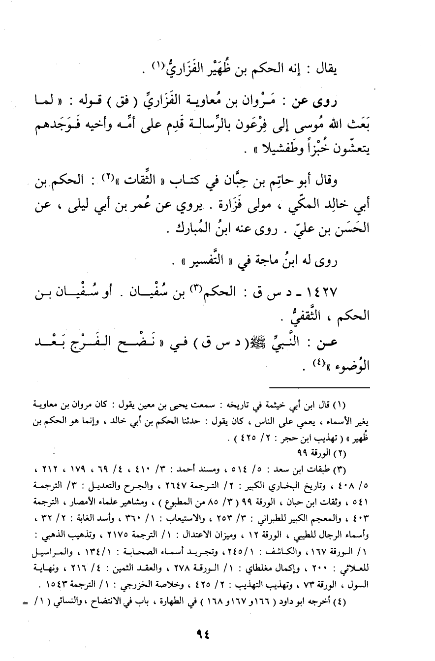 (1) قال ابن أَبي خيثمة فِي تاريخه: سمعت يحيى بْن مَعِين يَقُول: كان مروان بن معاوية يغير الأَسماء يعمي على الناس، كان يقول: حَدَّثَنَا الحكم بن أَبي خالد، وإنما هو الحكم بن ظهير" (تهذيب ابن حجر: 2 / 425) .