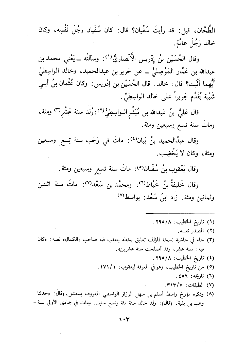(8) وذكره مؤرخ واسط أسلم بن سهل الرزاز الواسطي المعروف ببحشل، وَقَال: حَدَّثَنَا وهْبُ بْنُ بَقِيَّةَ (قال) : ولد خالد سنة مئة وتسع سنين، ومات في جماد الاولى سنة =