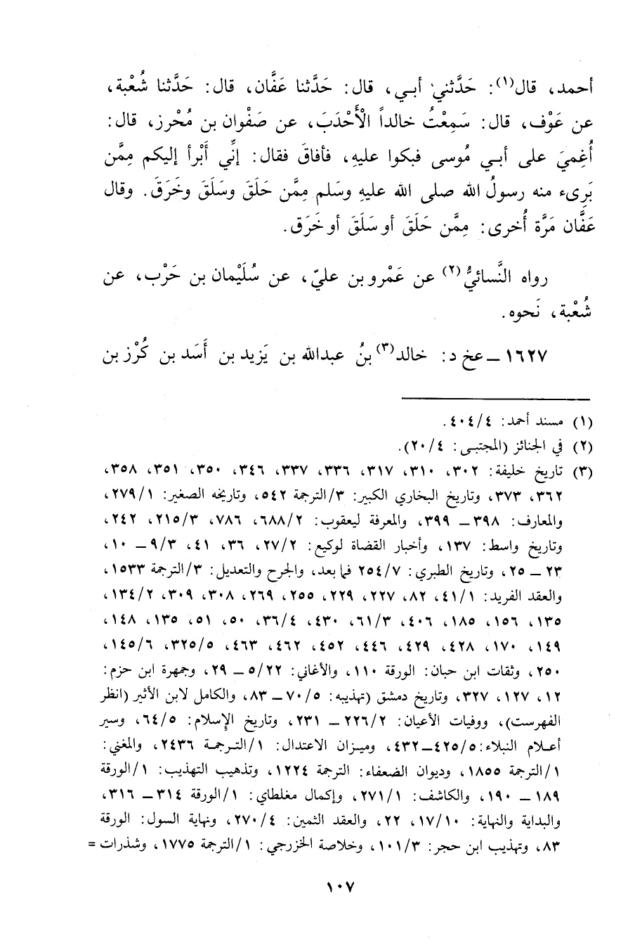 أَحْمَدَ، قال (1) : حَدَّثني أبي، قال: حَدَّثَنَا عَفَّانُ، قال: حَدَّثَنَا شُعْبَةُ، عَنْ عَوْفٍ، قال: سَمِعْتُ خَالِدًا الأَحْدَبُ، عَنْ صَفْوَانَ بْنِ مُحْرِزٍ، قال: أغمي على بي مُوسَى فَبَكُوا عَلَيْهِ، فَأَفَاقَ فَقَالَ: إِنِّي أَبْرَأَ إِلَيْكُمْ مِمَّنْ بَرِئَ مِنْهُ رَسُولُ اللَّهِ صَلَّى اللَّهُ عَلَيْهِ وسَلَّمَ مِمَّنْ حَلَقَ وسَلَقَ وخَرَقَ. وَقَال عَفَّانُ مَرَّةً أُخْرَى: مِمَّنْ حَلَقَ أَوْ سَلَقَ أَوْ خَرَقَ.
