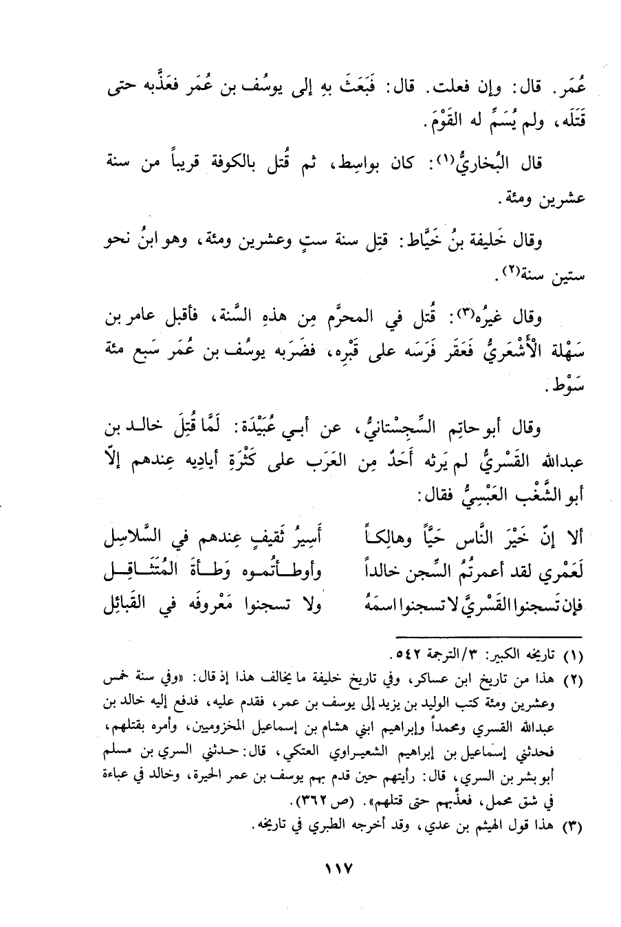 (2) هذا من تاريخ ابن عساكر، وفي تاريخ خليفة مايخالف هذا إذ قال: وفي سنة خمس وعشرين ومئة كتب الوليد بن يزيد إلى يوسف بن عُمَر، فقدم عليه، فدفع إليه خالد بْن عَبد الله القسري ومحمدا وإبراهيم ابني هشام بن إسماعيل المخزومين، وأمره بقتلهم، فحدثني إسماعيل بن إبراهيم الشعيراوي العتكي، قال: حدثني السري بن مسلم أبو بشر بن السري، قال: رأيتهم حين قدم بهم يوسف بن عُمَر الحيرة، وخالد في عباءة في شق محمل، فعذبهم حتى قتلهم". (ص 362) .