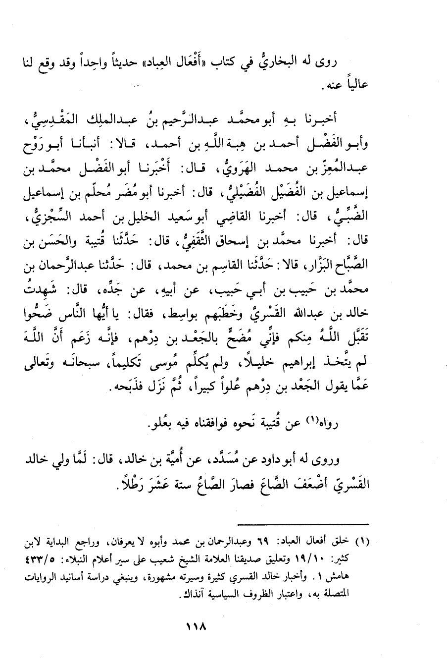 (1) خلق أفعال العباد: 69 وعبد الرحمن بن محمد وأبوه لا يعرفان، وراجع البداية لابن كثير: 10 / 19 وتعليق صديقنا العلامة الشيخ شعيب على سير أعلام النبلاء: 5 / 433 هامش 1. وأخبار خالد القسري كثيرة وسيرته مشهورة، وينبغي دراسة أسانيد الروايات المتصلة به. واعتبار الظروف السياسية آنذاك.