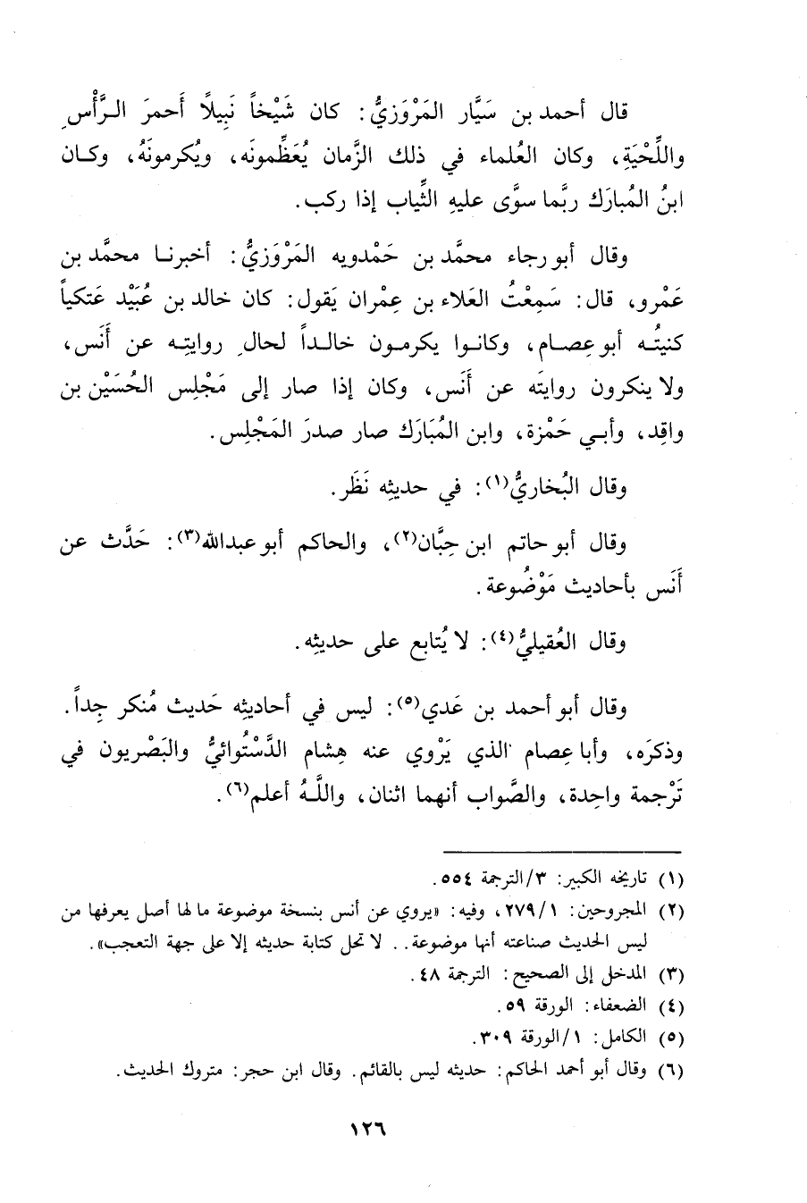 (2) المجروحين: 1 / 279، وفيه: يروي عن أنس بنسخة موضوعة ما لها أصل يعرفها من ليس الحديث صناعته أنها موضوعة..لا تحل كتابة حديثه إلا عَلَى جهة التعجب.