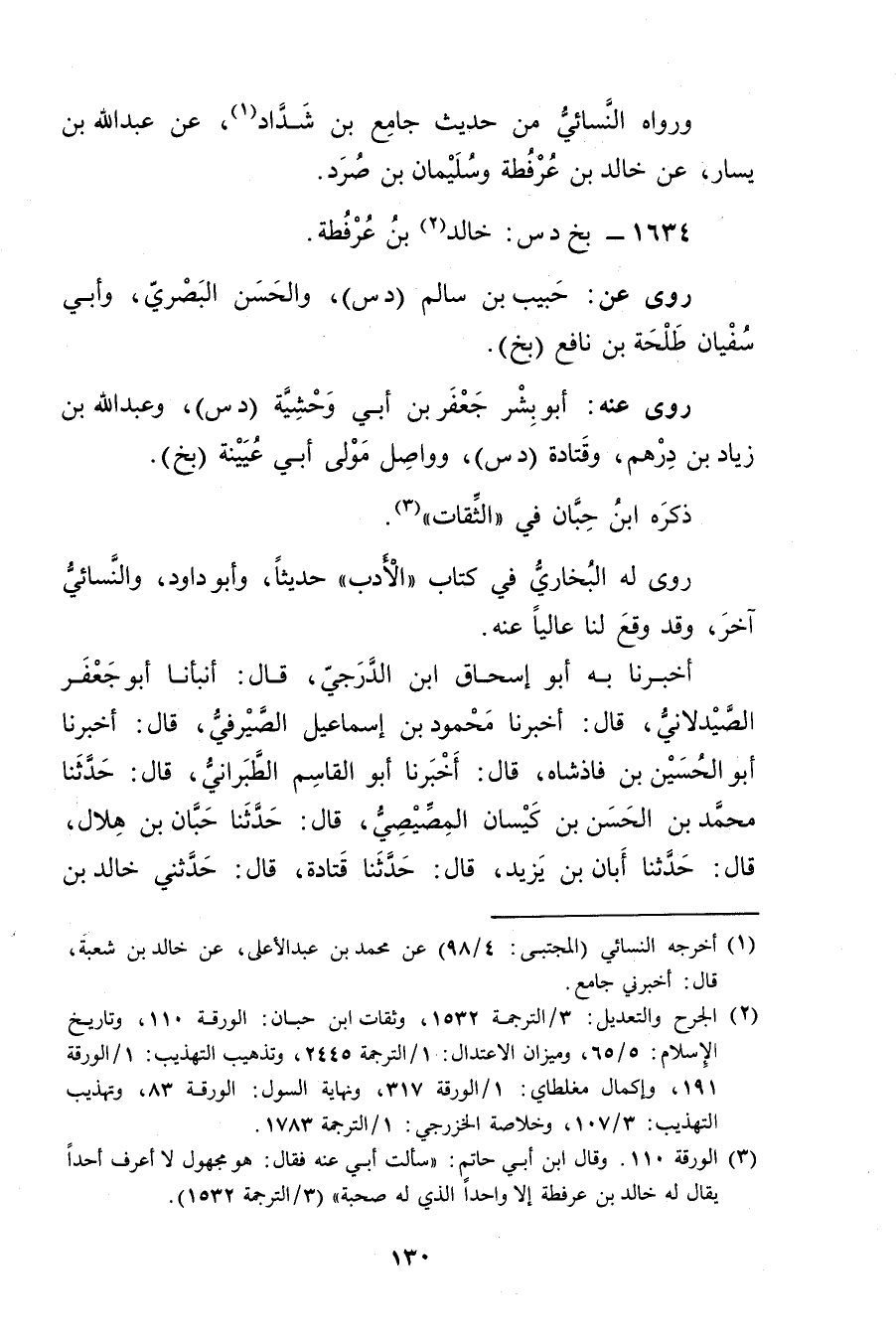 (3) الورقة 110، وَقَال ابن أَبي حَاتِم: سَأَلتُ أَبِي عَنْهُ فقال: هو مجهول لا أعرف أحدًا يقال له خالد بن عرفطة إلا واحدًا الذي له صحبة" (3 / الترجمة 1532) .