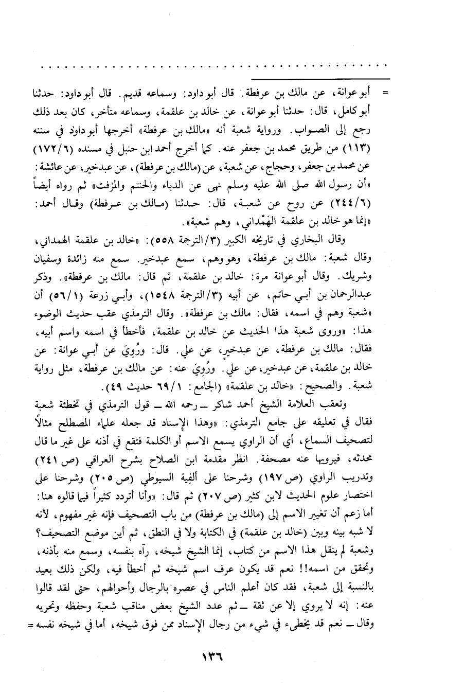 انظر مقدمة ابن الصلاح بشرح العراقي (ص (241) وتدريب الراوي (ص 197) وشرحنا على ألفية السيوطي (ص 205) وشرحنا على اختصار علوم الحديث لابن كثير (ص 207) ثم قال: وأنا أتردد كثيرا فيما قالوه هنا: أما زعم أن تغيير الاسم إلى (مالك بن عرفطة) من باب التصحيف فإنه غير مفهوم. لانه لا شبه بينه وبين (خالد بن علقمة) في الكتابة ولا في النطق، ثم أين موضع التصحيف؟ وشعبة لم ينقل هذا الاسم من كتاب، إنما الشيخ شيخه، رآه بنفسه، وسمع منه بأذنه، وتحقق من اسمه! ! نعم قد يكون عرف اسم شيخه ثم أخطأ فيه، ولكن ذلك بعيد بالنسبة إلى شعبة، فقد كان أعلم الناس في عصره بالرجال وأحوالهم.