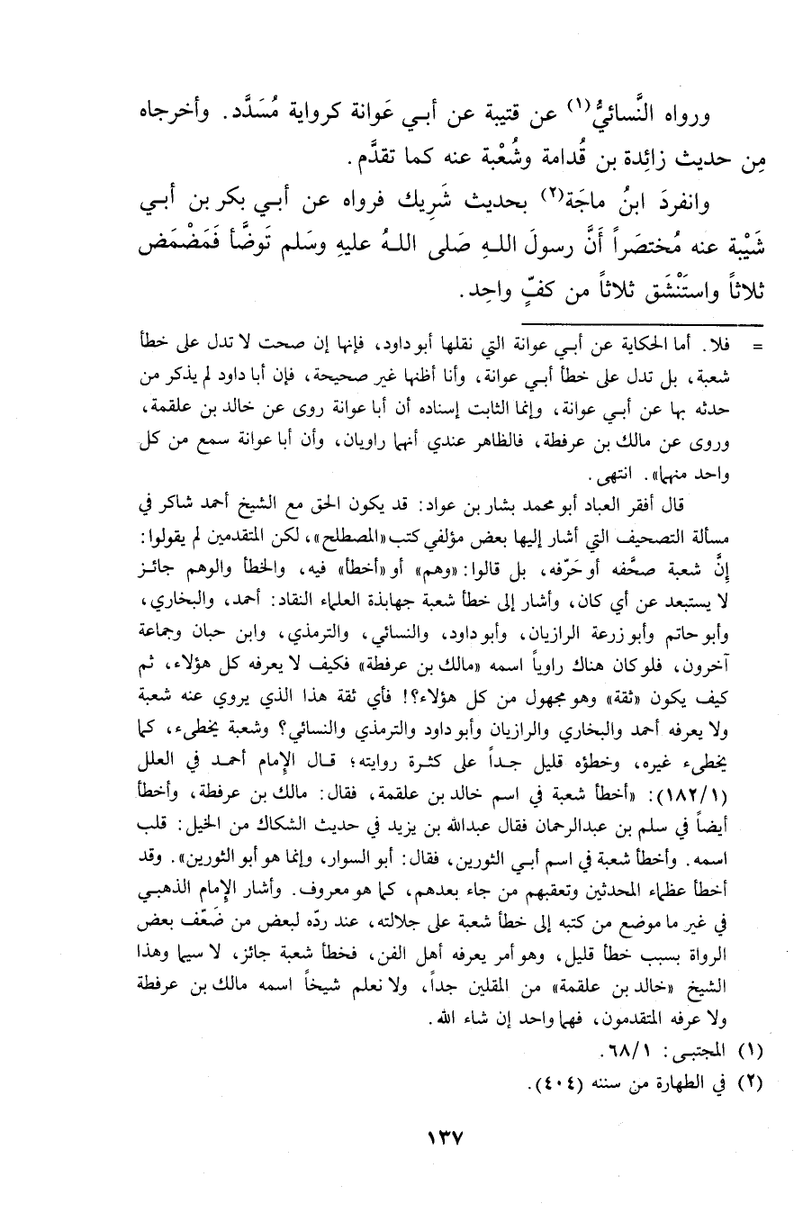 قال أفقر العباد أبو محمد بشار بن عواد: قد يكون الحق مع الشيخ أحمد شاكر في مسألة التصحيف التي أشار إليها بعض مؤلفي كتب"المصطلح"لكن المتقدمين لم يقولوا: إن شعبة صحفه أو حرفه، بل قالوا: وهم"أو"أخطأ"فيه، والخطأ والوهم جائز لا يستبعد عن أي كان، وأشار إلى خطأ شعبة جهابذة العلماء النقاد: أحمد، والبخاري، وأبو حاتم وأبو زُرْعَة الرازيان، وأبو داود، والنَّسَائي. والتِّرْمِذِيّ، وابن حبان وجماعة آخرون، فلو كان هناك راويا اسمه"ما لك بن عرفطة"فكيف لا يعرفه كل هؤلاء، ثم كيف يكون"ثقة"وهو مجهول من كل هؤلاء؟ ! فأي ثقة هذا الذي يروي عنه شعبة ولا يعرفه أحمد والبخاري والرازيان وأبو داود والتِّرْمِذِيّ والنَّسَائي؟ وشعبة يخطئ، كما (1 / 182) : أخطأ شعبة في اسم خالد بن علقمة، فقال: مالك بن عرفطة، وأخطأ أيضا في سلم بن عبد الرحمن فقال عَبد الله بن يزيد في حديث الشكاك من الخيل: قلب اسمه. وأخطأ شعبة في اسم أبي الثورين، فقال: أبو السوار، وإنما هو أبو الثورين"وقد أخطأ عظماء المحدثين في اسم أبي الثورين، فقال: أبو السوار، وإنما هو أبو الثورين"وقد أخطأ عظماء المحدثين وتعقبهم من جاء بعدهم كما هو معروف، وأشار الإمام الذهبي في غير ما موضع من كتبه إلى خطأ شعبة على جلالته، عند رده لبعض من ضعف بعض الرواة بسبب خطأ قليل، وهو أمر يعرفه أهل الفن، فخطأ شعبة جائز، لا سيما وهذا الشيخ"خالد بن علقمة"من المقلين جدا، ولا نعلم شيخا اسمه مالك بن عرفطة ولا عرفه المتقدمون، فهما واحد إن شاء الله.