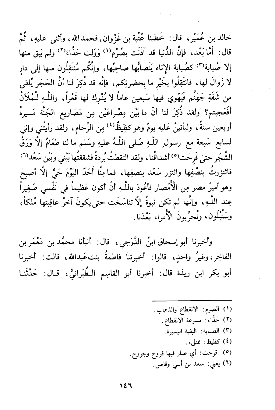 خالد بْن عُمَير، قال: خطبنا عتبة بْن غزوان، فحمد اللَّه، وأثنى عليه، ثم قال: أما بعد، فإن الدنيا قد آذنت بصرم (1) ، وولت حذاء (2) ولم يبق منها إلا صبابة (3) كصبابة الإناء يتصابها صاحبها، وإنكم منتقلون منها إِلَى دار لا زوال لها. فانتقلوا بخير ما بحضرتكم. فإنه فذ ذكر لنا أن الحجر يلقى من شفة جهنم فيهوي فيها سبعين عاما لا يدرك لها قعرا، والله لتملأن أفعجبتم؟ ولقد ذكر لنا أم ما بين مصراعين من مصاريع الجنة مسيرة أربعين سنة، وليأتين عليه يوم وهو كظيظ (4) من الزحام، ولقد رأيتني وإني لسابع سبعة من رسول الله صلى الله عليه وسلم ما لنا طعام إلا ورق الشجر حتى قرحت (5) أشداقنا، ولقد التقطت بردة فشققتها بيني وبين سعد (6) فائتزرت بنصفها وائتزر سعد بنصفها، فما منا أحد اليوم حي إلا أصبح وهو أمير مصر من الأمصار فأعوذ بالله أن أكون عظيما فِي نفسي صغيرا عند اللَّه، وإنها لم تكن نبوة إلا تناسخت حتى يكون آخر عاقبتها ملكا، وستبلون وتجربون الأمراء بعدنا.