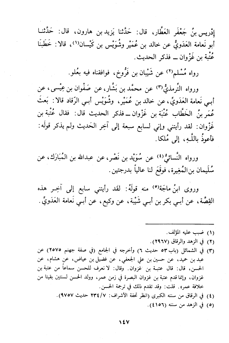 (3) في الشمائل (باب 53 حديث 6) وأخرجه في الجامع (في صفة جهنم 2575) عَنْ عَبْدِ بْنِ حُمَيْدٍ، عَنْ حُسَيْنُ بْنُ عَلِيٍّ الْجُعْفِيُّ، عَنْ فضيل بن عياض، عَن هشام، عَن الحسن، قال: قال عتبة بن غزوان، وَقَال: لا نعرف للحسن سماعا من عتبة بن غزوان، وإنما قدم عتبة بن غزوان البصرة في زمن عُمَر، وولد الْحَسَن لسنتين بقيتا من خلافة عُمَر"قلت: وقد تقدم ذلك في ترجمة الحسن.