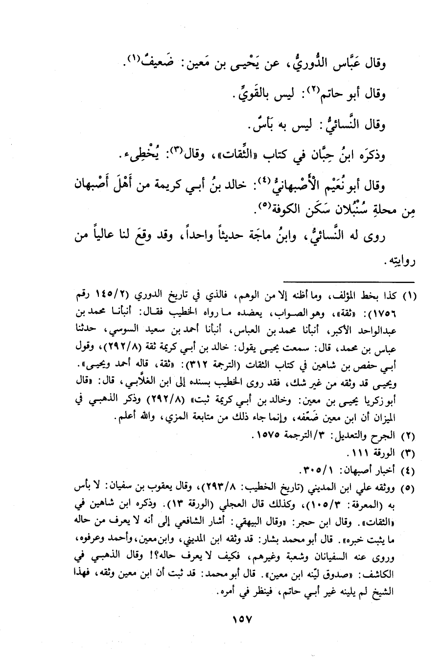 (1) كذا بخط المؤلف، وما أظنه إلا من الوهم، فالذي في تاريخ الدوري (2 / 145 رقم 1756) : ثقة"وهو الصواب يعضده ما رواه الخطيب فقال: أنبأنا مُحَمَّد بْن عَبْد الواحد الأكبر، أنبأنا محمد بن العباس، أنبأنا أحمد بن سَعِيد السوسي، حَدَّثَنَا عباس بْن مُحَمَّد، قال: سمعت يحيى يقول: خالد بن أَبي كريمة ثقة (8 / 292) ، وقول أبي حَفْصِ بْنُ شاهين فِي كتاب الثقات (الترجمة 312) : ثقة، قاله أحمد ويحيى". ويحيى قد وثقه من غير شك، فقد روى الخطيب بسنده إلى ابن الغلابي، قال: قال أبو زكريا يحيى بن مَعِين: وخالد بن أَبي كريمة ثبت" (8 / 292) وذكر الذهبي في الميزان أن ابن مَعِين ضعفه، وإنما جاء ذلك من متابعة المزي، والله أعلم.