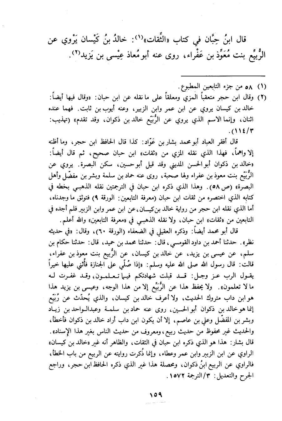 قال أفقر العباد أبو محمد بشار بن عواد: كذا قال الحافظ ابن حجر، وما أظنه إلا واهما، فهذا الذي نقله الذي من"ثقات"ابن حبان صحيح، ثم قال أيضا: خالد بن ذكوان أبو الحسن المديني وقد قيل أبو حسين، سكن البصرة. يروي عن الربيع بنت معوذ بن عفراء ولها صحبة، روى عنه حماد بن سلمة وبشر بن مفضل وأهل البصرة" (ص 58) وهذا الذي ذكره ابنُ حِبَّان في الترجمتين نقله الذهبي بخطه في كتابه الذي اختصره من ثقات ابن حبان (معرفة التابعين: الورقة 9) فتوثق ما وجدناه، أما الذي نقله ابن حجر من رواية خالد بن كيسان، عن ابن عُمَر وابن الزبير فلم أجده في التابعين من"ثقات"ابن حبان، ولا نقله الذهبي في "معرفة التابعين"والله أعلم،