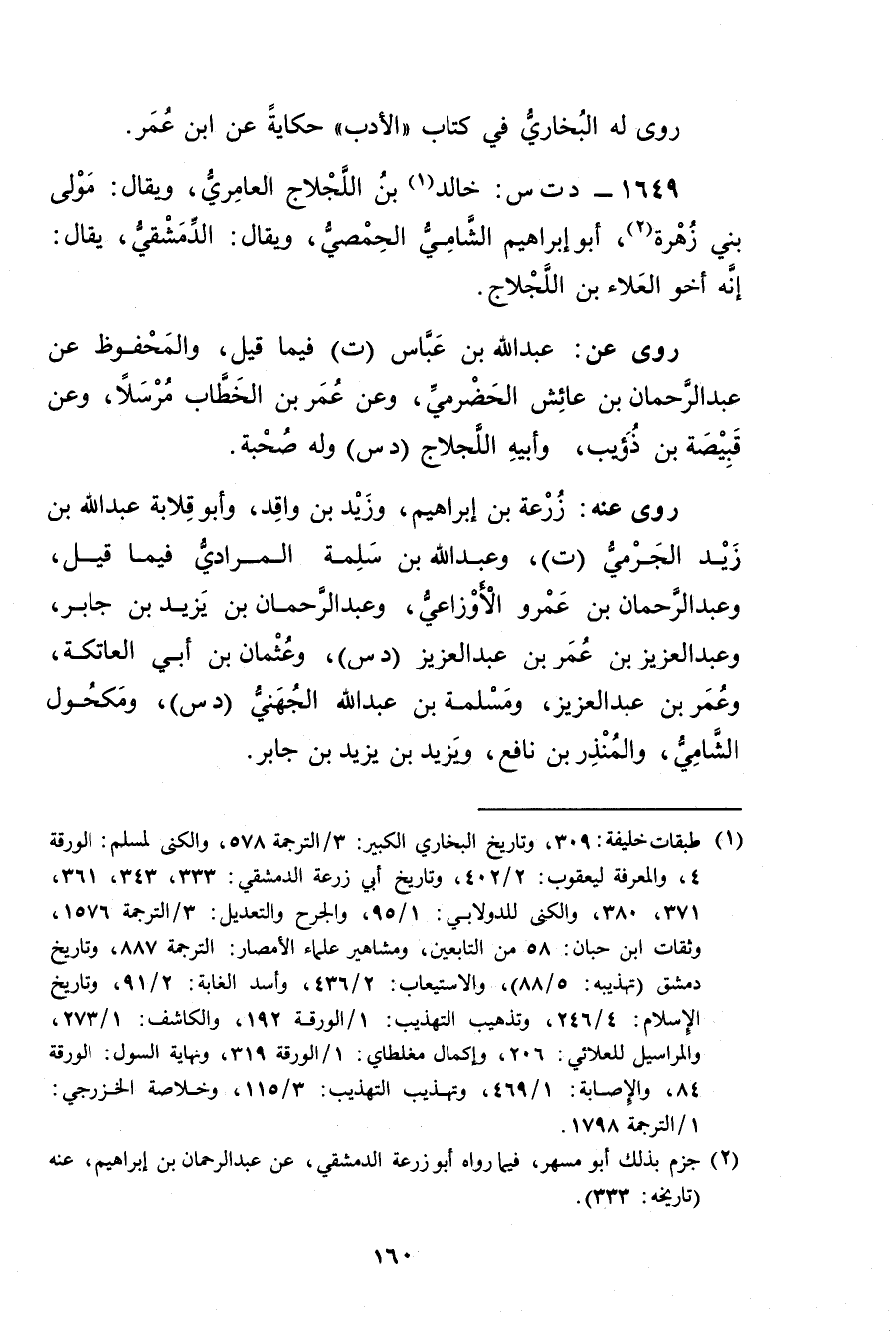 1649 - د ت س: خالد بن اللجلاج العامري (1) ، ويُقال: مولى بني زهرة (2) ، أَبُو إِبْرَاهِيم الشامي الحمصي، ويُقال: الدمشقي، يقَالَ: إنه أخو العلاء بْن اللجلاج.