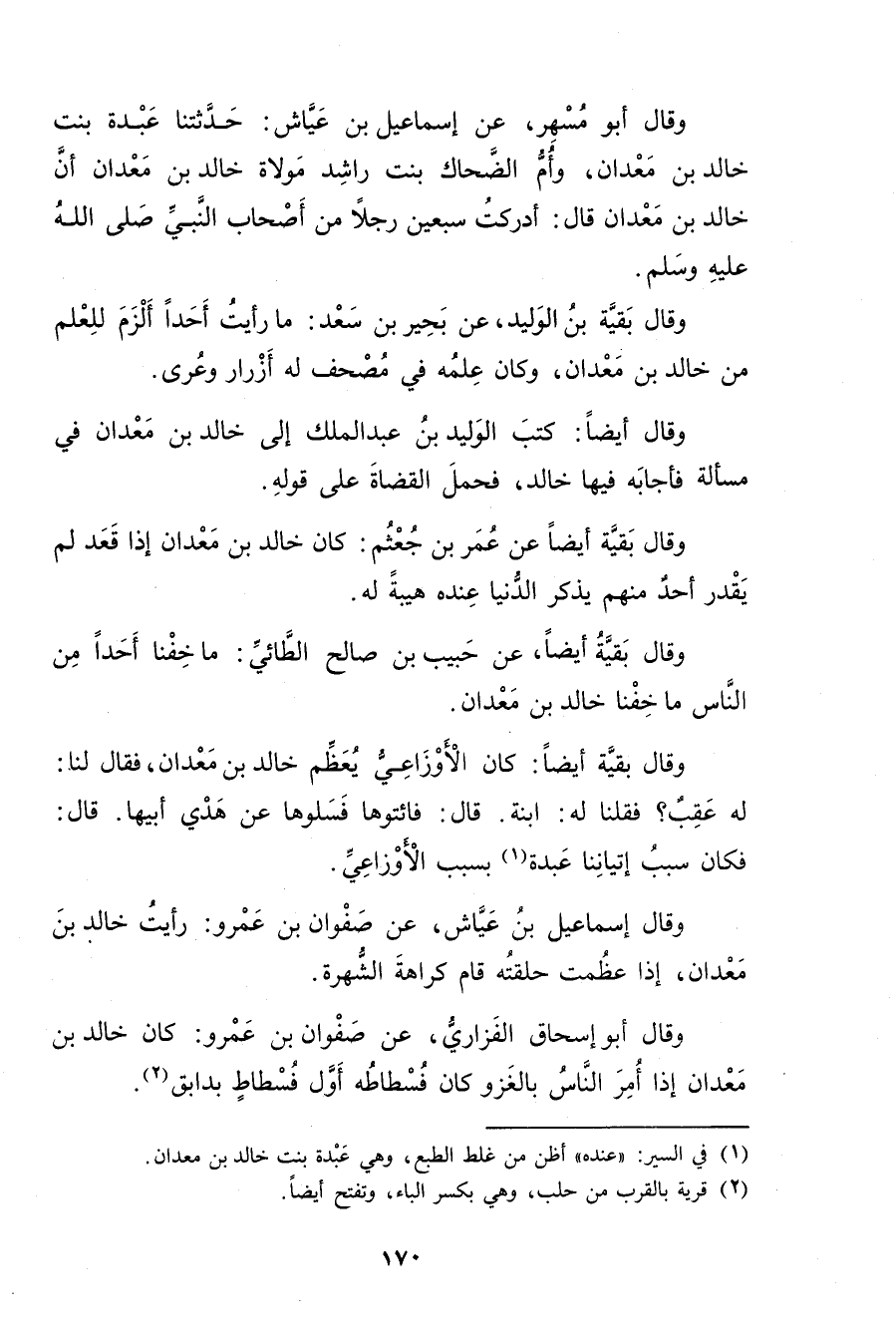 وَقَال أَبُو مسهر، عَنْ إِسْمَاعِيل بْن عياش: حدثتنا عبدة بنت خالد بْن معدان، وأم الضحاك بنت راشد مولاة خالد بْن معدان أن خالد بْن معدان قال: أدركت سبعين رجلا من أصحاب النَّبِيّ صَلَّى اللَّهُ عليه وسَلَّمَ.