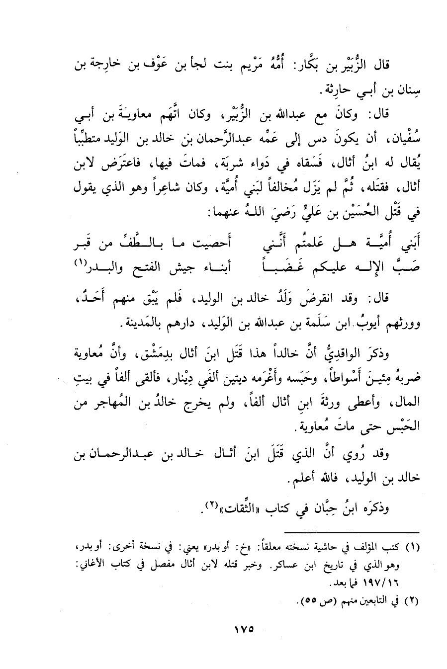(1) كتب المؤلف في حاشية نسخته معلقا: خ: أو بدر"يعني: في نسخة أخرى: أو بدر، وهو الذي في تاريخ ابن عساكر. وخبر قتله لابن أثال مفصل في كتاب الاغاني: 16 / 197، فما بعد.