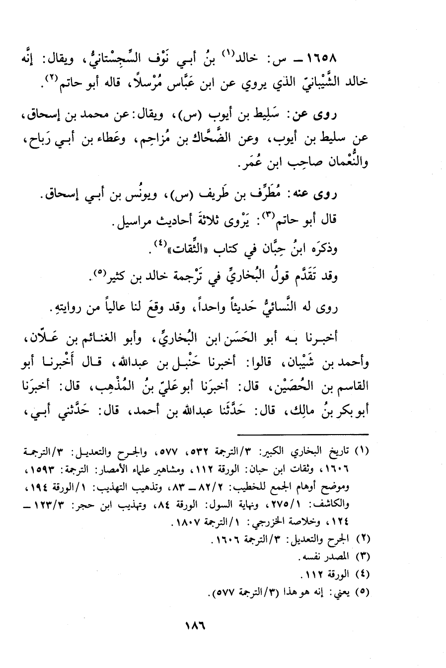 1658 - س: خالد بن أَبي نوف السجستانئ (1) ، ويُقال: إنه خالد الشيباني الذي يروي عَنِ ابن عباس مُرْسلاً، قاله أَبُو حاتم (2) .