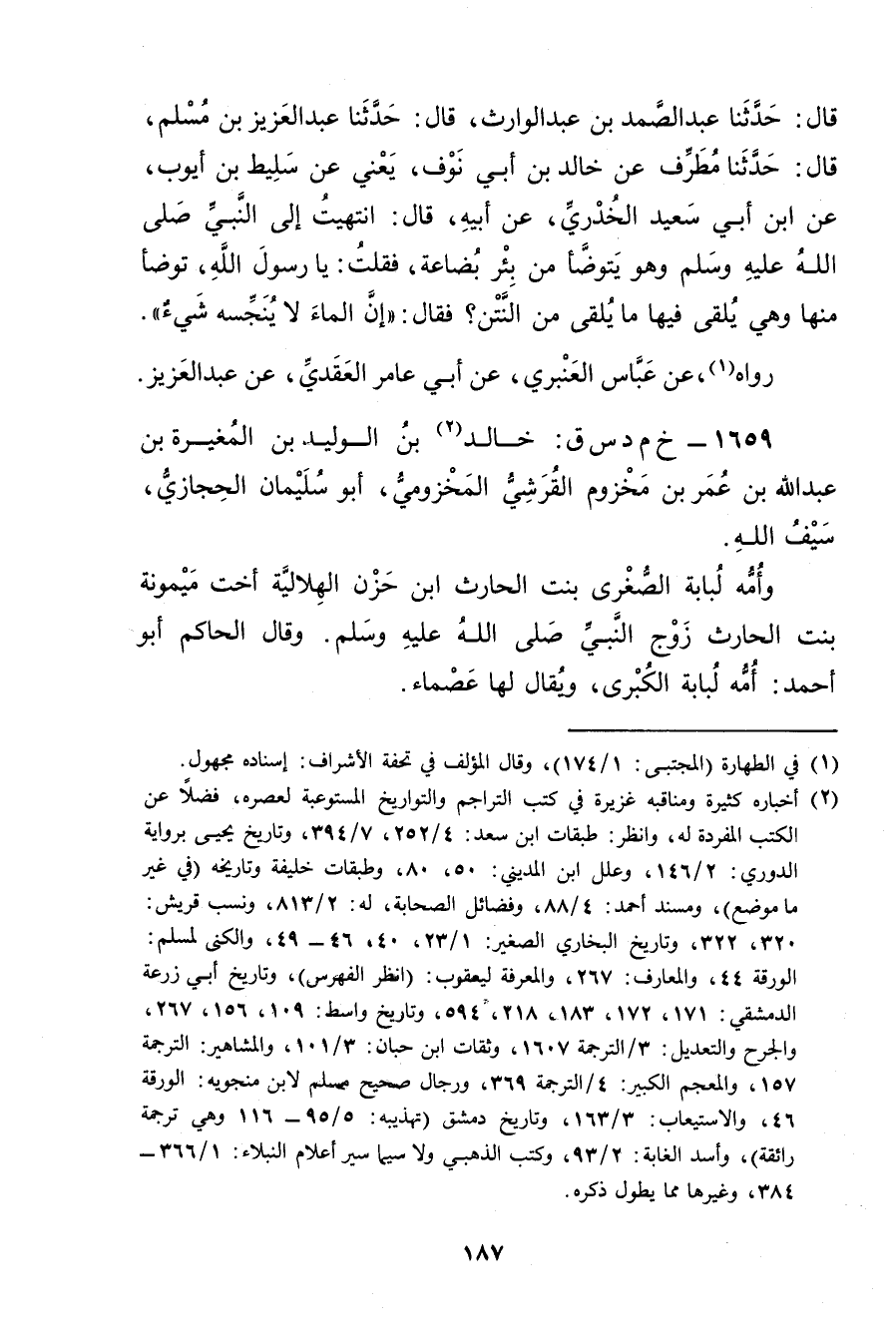 (2) أخباره كثيرة ومناقبه غزيرة في كتب التراجم والتواريخ المستوعبة لعصره، فضلا عن الكتب المفردة له، وانظر: طبقات ابن سعد: 4 / 252، 7 / 394، وتاريخ يحيى برواية الدوري: 2 / 146، وعلل ابن المديني: 50، 80، وطبقات خليفة وتاريخه (في غير ما موضع) ، ومسند أحمد: 4 / 88، وفضائل الصحابة، له: 2 / 813، ونسب قريش: 320، 322، وتاريخ البخاري الصغير: 2 / 23، 40، 46 - 49، والكنى لمسلم: الورقة 44، والمعارف: 267، والمعرفة ليعقوب:، وتاريخ أبي زرعة الدمشقي: 171، 172، 183، 218، 594، وتاريخ واسط: 109، 156، 267، والجرح والتعديل: 3 / الترجمة 1607، وثقات ابن حبان: 3 / 101، والمشاهير: الترجمة 157، والمعجم الكبير: 4 / الترجمة 369، ورجال صحيح مسلم لابن منجويه: الورقة 46، والاستيعاب: 3 / 163، وتاريخ دمشق (تهذيبه: 5 / 95 - 116، وهي ترجمة رائقة) وأسد الغابة: 2 / 93، وكتب الذهبي ولا سيما سير أعلام النبلاء: 1 / 366 - 384، وغيرها مما يطول ذكره.