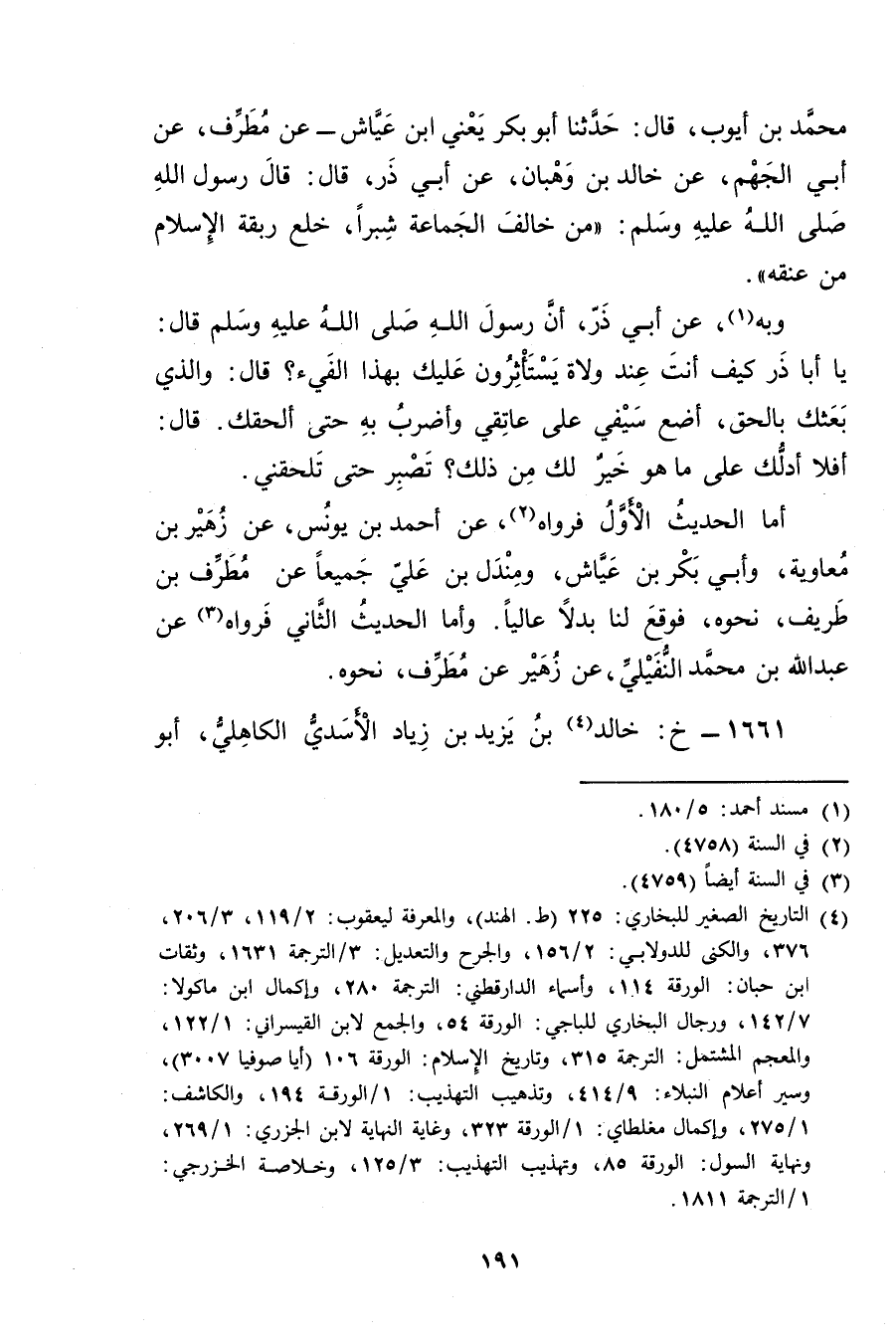 مُحَمَّدِ بْنِ أَيُّوبَ، قال: حَدَّثَنَا أَبُو بَكْر يَعْنِي ابْنَ عَيَّاشٍ، عَن مُطَرَّفٍ، عَن أَبِي الْجَهْمِ، عن خالد بن وهابن، عَن أَبِي ذَرٍّ، قال: قال رَسُول اللَّهِ صلى الله عليه وسَلَّمَ: مَنْ خَالَفَ الْجَمَاعَةَ شِبْرًا، خَلَعَ رِبْقَةَ الإِسْلامِ مِنْ عُنُقِهِ.