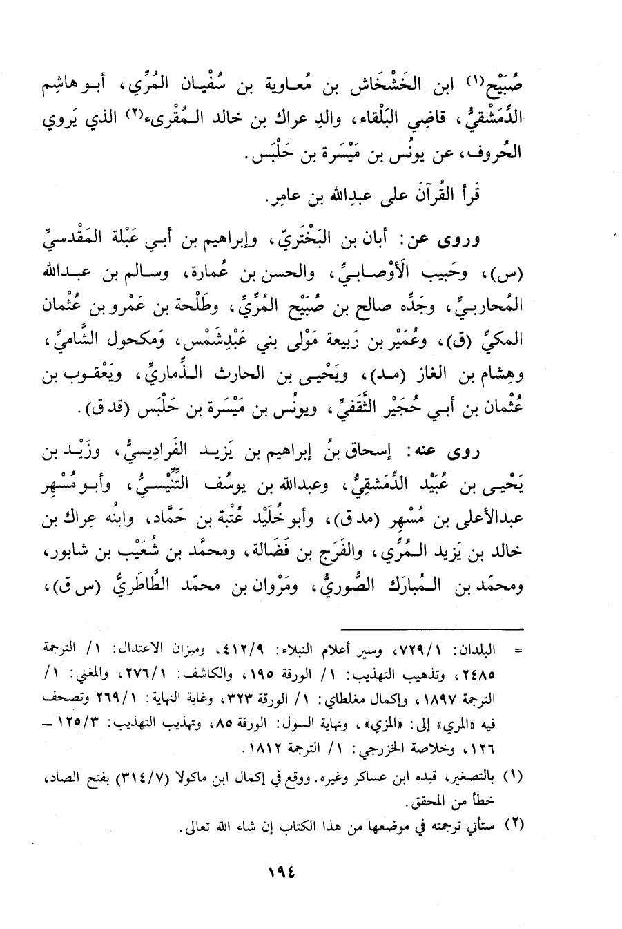 = البلدان 1 / 729، وسير أعلام النبلاء: 9 / 412، وميزان الاعتدال: 1 / الترجمة 2485، وتذهيب التهذيب: 1 / الورقة 195، والكاشف: 1 / 276، والمغني: 1 / الترجمة 1897، وإكمال مغلطاي: 1 / الورقة 323، وغاية النهاية: 1 / 269، وتصحف فيه"المري"إلى: المزي"ونهاية السول: الورقة 85، وتهذيب التهذيب: 3 / 125 - 126، وخلاصة الخزرجي: 1 / الترجمة 1812 (1) بالتصغير، قيده ابن عساكر وغيره، ووقع في إكمال ابن ماكولا (7 / 314) بفتح الصاد، خطأ من المحقق.