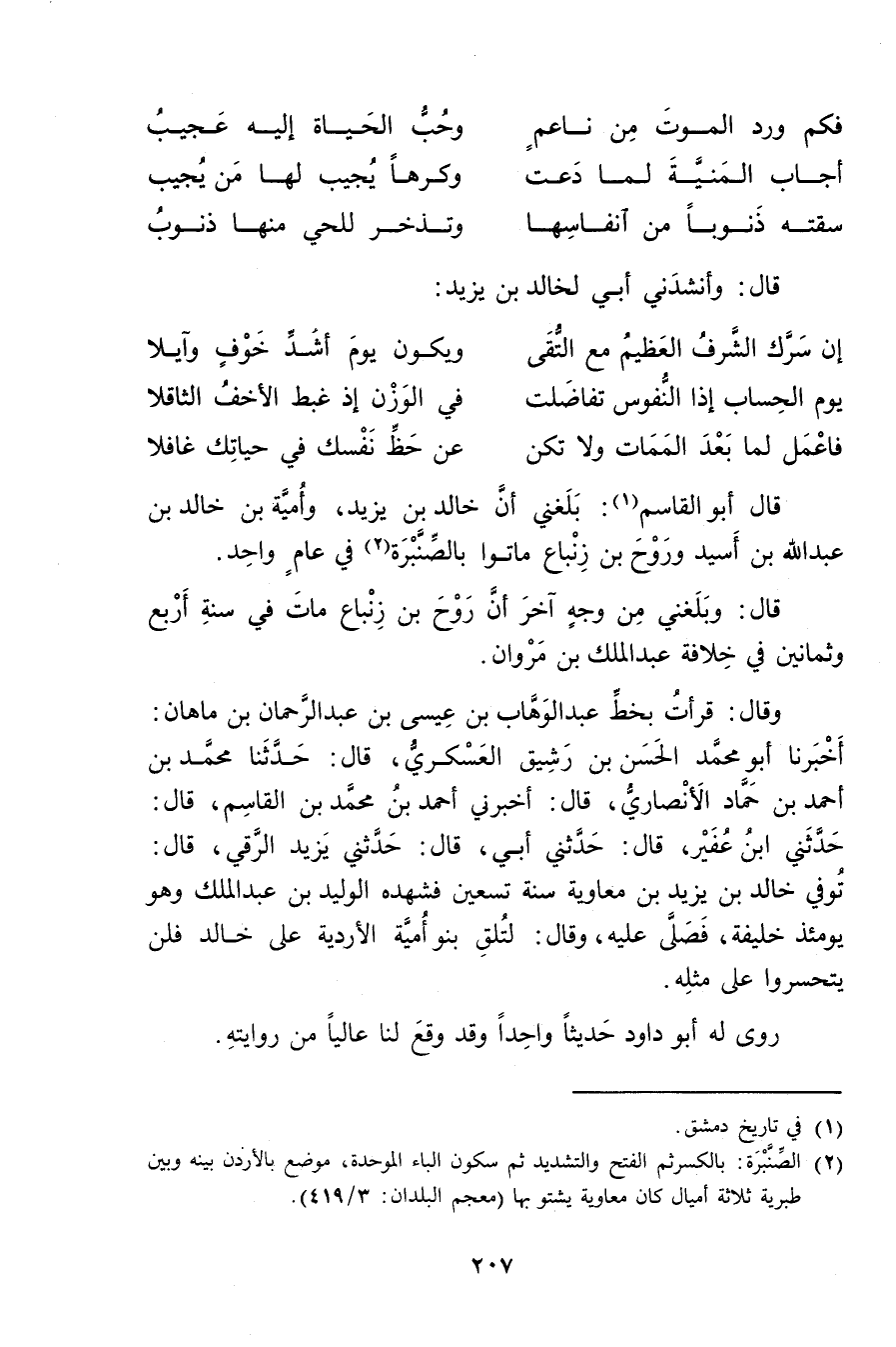 وَقَال: قرأت بخط عبد الوهاب بْن عيسى بْن عبد الرحمن بْن ماهان: أَخْبَرَنَا أَبُو مُحَمَّد الْحَسَن بْن رشيق العسكري. قال: حَدَّثَنَا مُحَمَّد بْن أَحْمَدَ بْن حماد الأَنْصارِيّ. قال: أَخْبَرَنِي أَحْمَد بْن مُحَمَّد بْن الْقَاسِم، قال: حَدَّثَنِي ابن عفير، قال: حَدَّثني أَبِي، قال: حَدَّثَنِي يزيد الرَّقِّيّ، قال: توفي خَالِد بْن يزيد بْن مُعَاوِيَة سنة تسعين فشهده الْوَلِيد بْن عَبد المَلِك وهو يومئذ خليفة، فصلى عليه، وَقَال: لتلق بنو أمية الأردية عَلَى خالد فلن يتحسروا عَلَى مثله.