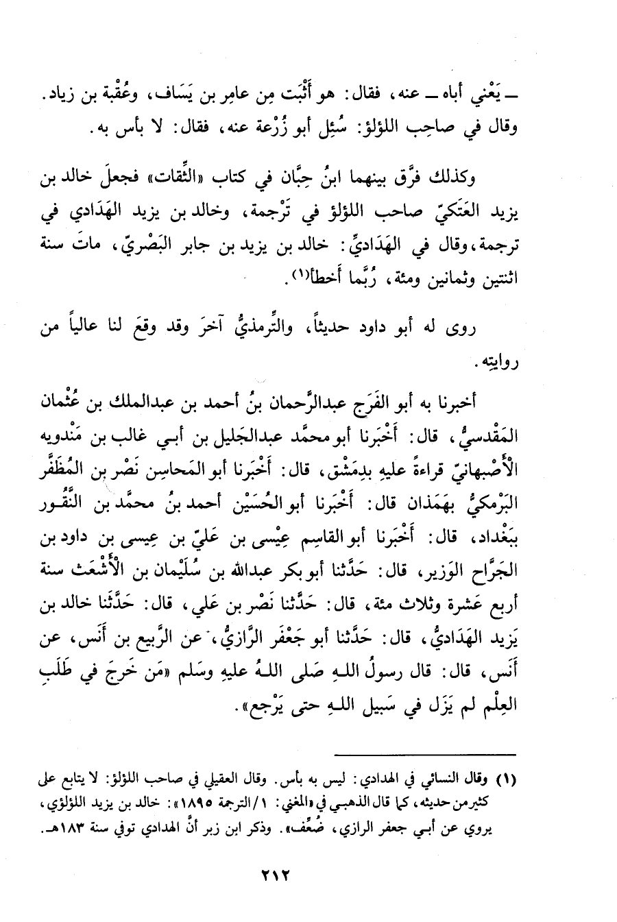 أخبرنا بِهِ أَبُو الْفَرَجِ عَبْدُ الرَّحْمَنِ بْنُ أَحْمَدَ بْنِ عَبد المَلِك بْنِ عُثْمَانَ الْمَقْدِسِيُّ، قال: أَخْبَرَنَا أَبُو مُحَمَّدٍ عَبْدُ الْجَلِيلِ بْنُ أَبي غَالِبِ بْنِ مَنْدَوَيْهِ الأَصْبَهَانِيُّ قِرَاءَةً عَلَيْهِ بِدِمَشْقَ، قال: أخبرنا أَبُو الْمَحَاسِنِ نَصْرُ بْنُ الْمُظَفَّرِ الْبَرْمَكِيُّ بِهَمَذَانَ قال: أخبرنا أَبُو الْحُسَيْنِ أَحْمَدُ بْنُ مُحَمَّدِ بْنِ النَّقُّورِ بِبَغْدَادَ، قال: أَخْبَرَنَا أبو القاسم عيسى بْن علي بْن عيسى بْن داود بْن الْجَرَّاحِ الْوَزِيرُ، قال: حَدَّثَنَا أَبُو بَكْر عَبد اللَّهِ بْنُ سُلَيْمان بْنِ الأَشْعَثِ سَنَةَ أَرْبَعَ عَشْرَةَ وثلاث مئة، قال: حَدَّثَنَا نَصْرُ بْنُ عَلِيٍّ، قال: حَدَّثَنَا خَالِدُ بْنُ يَزِيدَ الْهَدَادِيُّ، قال: حَدَّثَنَا أَبُو جَعْفَر الرازي، عن الربيع بْن أنس، عَنْ أَنَسٍ، قال: قال رَسُولُ اللَّهِ صلى الله عليه وسلم"مَنْ خَرَجَ فِي طَلَبِ الْعِلْمِ لَمْ يَزَلْ فِي سَبِيلِ اللَّهِ حتى يرجع.