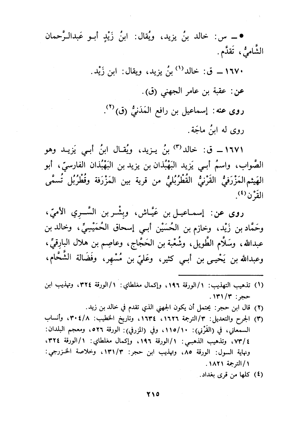 1671 - ق: خالد بن يزيد (3) ، ويُقال ابن أَبي يزيد وهو الصواب، واسم أبي يزيد البهبذان بْن يزيد بْن البهبذان الفارسي، أَبُو الهيثم المزرفي القرني القطربلي من قرية بين المزرفة وقطربل تسمى القرن (4) .