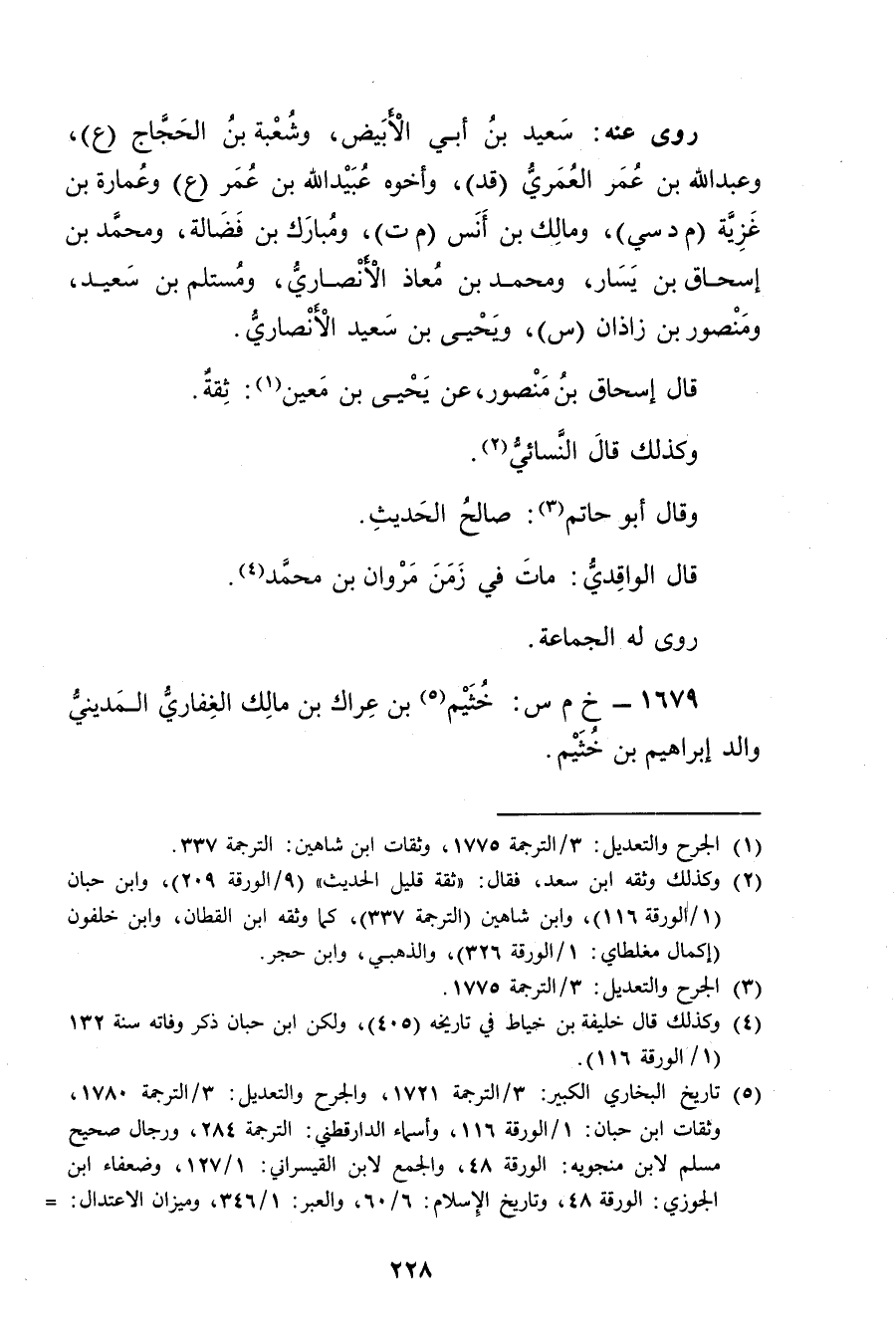 (5) تاريخ البخاري الكبير: 3 / الترجمة 1721، والجرح والتعديل: 3 / الترجمة 1780, وثقات ابن حبان: 1 / الورقة 116، وأسماء الدَّارَقُطنِيّ: الترجمة 284، ورجال صحيح مسلم لابن منجويه: الورقة 48.