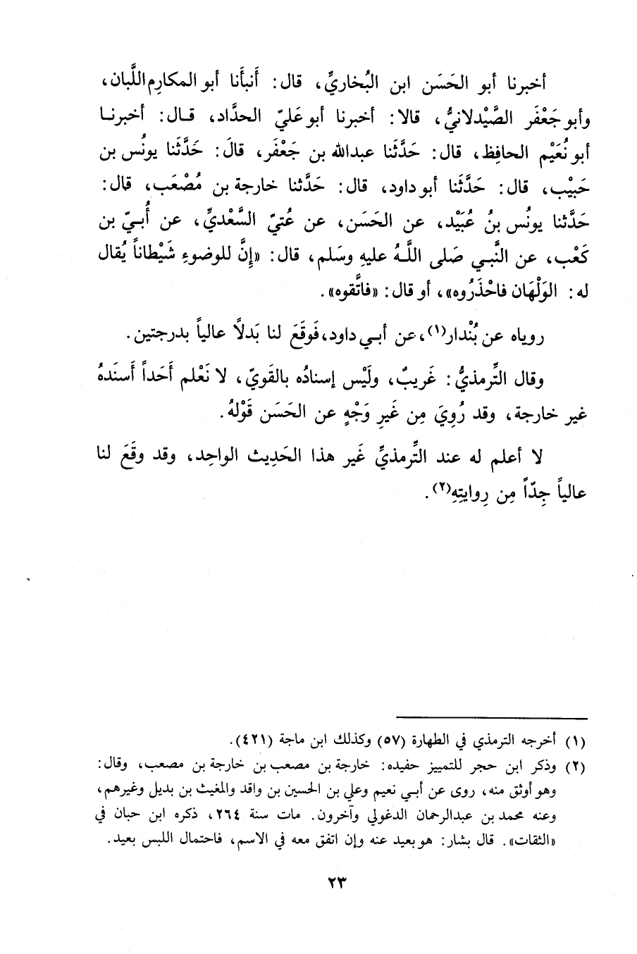 أَخْبَرَنَا أَبُو الْحَسَنِ بْنُ الْبُخَارِيِّ، قال: أَنْبَأَنَا أَبُو المكارم اللبان، وأبو جعفر الصيدلاني، قالا: أخبرنا أَبُو عَلِيّ الحداد، قال: أَخْبَرَنَا أَبُو نعيم الحافظ، قال: حَدَّثَنَا عَبد الله بْن جعفر، قال: حَدَّثَنَا يُونُسُ بْنُ حَبِيبٍ، قال: حَدَّثَنَا أَبُو داود، قال: حَدَّثَنَا خَارِجَةُ بْنُ مُصْعَبٍ، قال: حَدَّثَنَا يونس بْن عُبَيد، عن الْحَسَن. عَنْ عُتَيٍّ السَّعْدِيِّ، عَن أُبَيِّ بْنِ كَعْبٍ، عَنِ النَّبِيِّ صَلَّى اللَّهُ عَلَيْهِ وسَلَّمَ، قال: إن لِلْوُضُوءِ شَيْطَانًا يُقَالَ لَهُ: الْوَلْهَانُ فَاحْذَرُوهُ"أَوْ قال: فَاتَّقُوهُ.