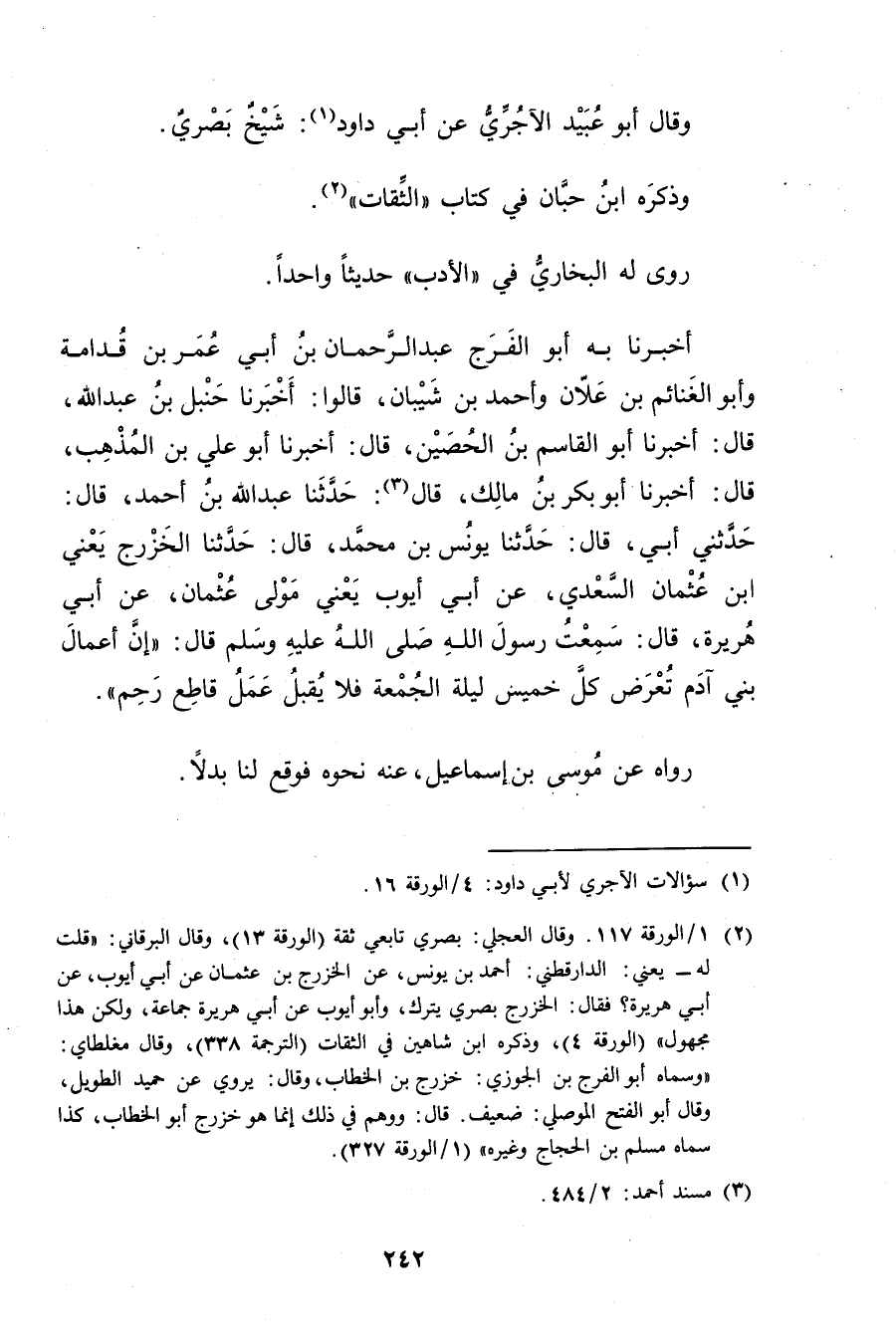 أخبرنا بِهِ أَبُو الْفَرَجِ عَبْدُ الرَّحْمَنِ بْنُ أَبي عُمَر بْنِ قُدَامَةَ وأَبُو الْغَنَائِمِ بْن علان وأحمد بْن شيبان، قالوا: أَخْبَرَنَا حنبل بْن عَبد اللَّهِ، قال: أخبرنا أَبُو الْقَاسِمِ بْن الحصين، قال أَخْبَرَنَا أبو علي بْن المذهب قال: أَخْبَرَنَا أبو بكر بْن مالك, قال (3) : حَدَّثَنَا عَبد اللَّهِ بْنُ أَحْمَدَ، قال: حَدَّثني أبي، قال: حَدَّثَنَا يُونُسُ بْنُ مُحَمَّدٍ، قال: حَدَّثَنَا الْخَزْرَجُ يَعْنِي ابْنَ عُثْمَانَ السَّعْدِيَّ، عَن أَبِي أَيُّوبَ يَعْنِي مَوْلَى عُثْمَانَ، عَن أَبِي هُرَيْرة قال: سمعت رَسُول اللَّهِ صَلَّى اللَّهُ عَلَيْهِ وسَلَّمَ قال: إِنَّ أَعْمَالَ بَنِي آدَمَ تُعْرَضُ كُلَّ خَمِيسِ لَيْلَةِ الْجُمْعَةِ فَلا يُقْبَلُ عَمَلُ قاطع رحيم.
