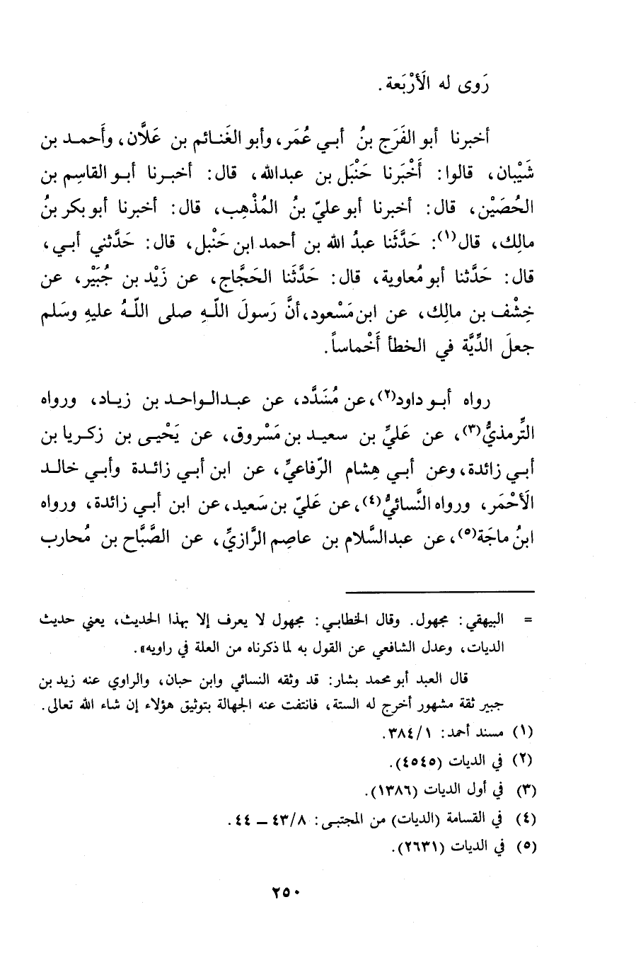 عَنِ ابْنِ مَسْعُودٍ، أَنَّ رَسُول اللَّهِ صلى الله عليه وسَلَّمَ جَعَلَ الدِّيَةَ فِي الْخَطَأِ أَخْمَاسًا.
