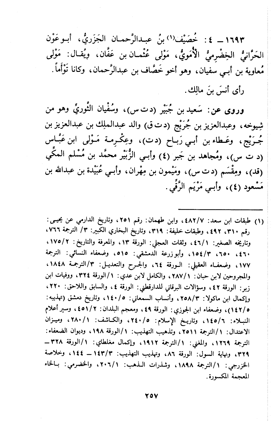 1693 - 4: خصيف بن عَبْد الرَّحْمَنِ الجزري (1) ، أَبُو عون الحراني الخضرمي الأُمَوِي مولى عُثْمَان بْن عفان, ويُقال: مولى معاوية بْن أَبي سفيان، وهو أخو خصاف بْن عَبْد الرحمن، وكانا توأما.