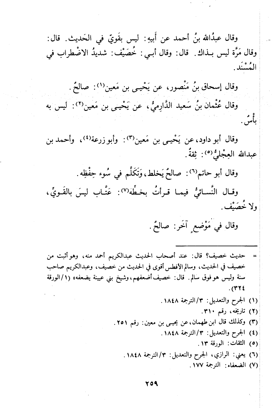 = حديث خصيف؟ قال: عند أصحاب الحديث عبد الكريم أحمد منه، وهو أثبت من خصيف في الحديث، وسالم الافطس أقوى في الحديث من خصيف، وعبد الكريم صاحب سنة وليس هو فرق سالم. قال: خصيف أضعفهم، وشيخ بني عُيَيْنَة يضعفه" (1 / الورقة 324) .