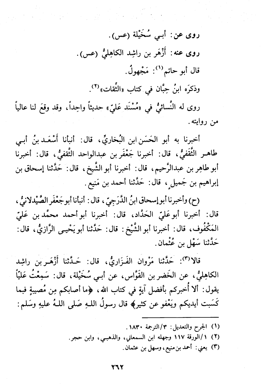 قَالا (3) : حَدَّثَنَا مَرْوَانُ الْفَزَارِيُّ، قال: حَدَّثَنَا أَزْهَرُ بْنُ رَاشِدٍ الْكَاهِلِيُّ، عَنِ الْخِضْرِ بْنِ الْقَوَّاسِ، عَن أَبِي سُخَيْلَةَ، قال: سَمِعْتُ عَلِيًّا يَقُولُ: أَلا أُخْبِرُكُمْ بِأَفْضَلِ آيَةٍ فِي كِتَابِ اللَّهِ (ما أصابكم من مصيبة فبما كسبت أيديكم ويعفو عَنْ كثير) قال رَسُول اللَّهِ صلى الله عليه وسلم: