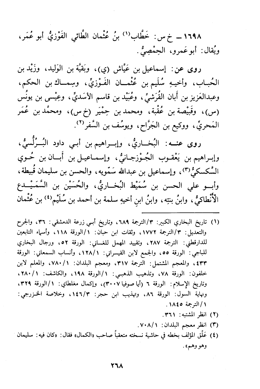 1698 - خ س: خطاب بن عُثْمَانَ الطائي الفوزي (1) أَبُو عُمَر، ويُقال: أَبُو عَمْرو، الحمصي.