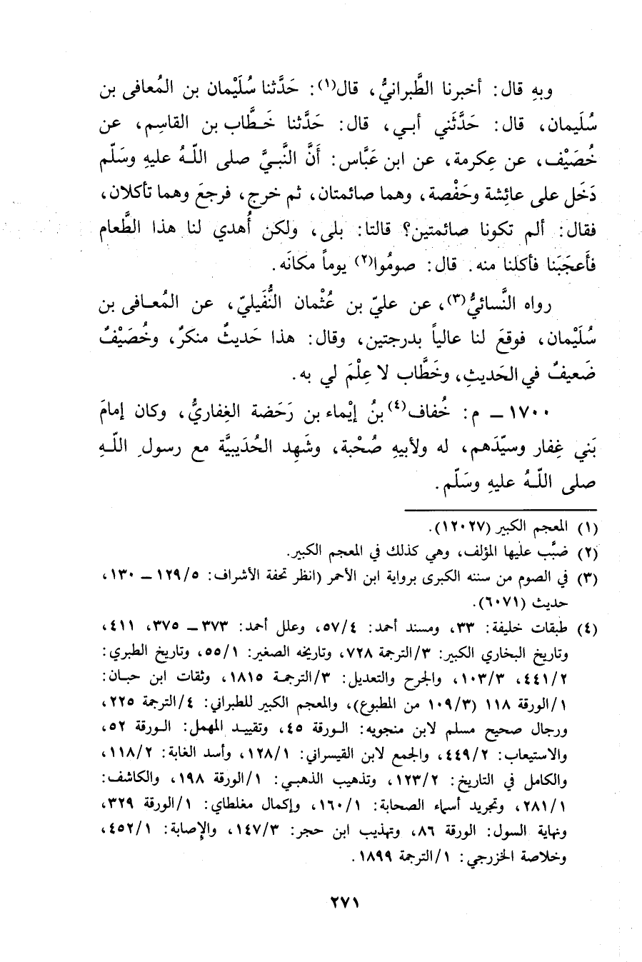 رواه النَّسَائي (3) ، عَنْ عَلِيّ بْن عُثْمَانَ النفيلي، عَنِ المعافى بْن سُلَيْمان، فوقع لنا عاليا بدرجتين، وَقَال: هذا حديث منكر، وخصيف ضعيف فِي الحديث، وخطاب لا علم لي بِهِ.