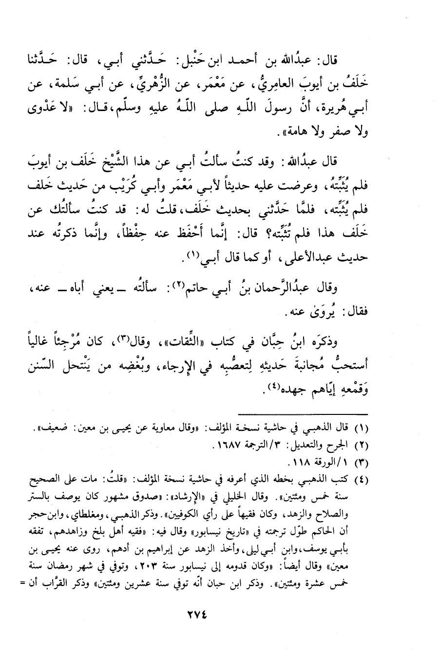 قال: عَبد اللَّهِ بْن أحمد بْن حنبل: حَدَّثني أبي، قال: حَدَّثَنَا خَلَفُ بْنُ أَيُّوبَ الْعَامِرِيُّ، عَنْ مَعْمَرٍ، عَنِ الزُّهْرِيّ، عَن أبي سلمة، عَن أبي هُرَيْرة، أَنَّ رَسُولَ اللَّهِ صَلَّى اللَّهُ عَلَيْهِ وسَلَّمَ، قال: لا عَدْوَى ولا صَفَرَ ولا هَامَةَ.